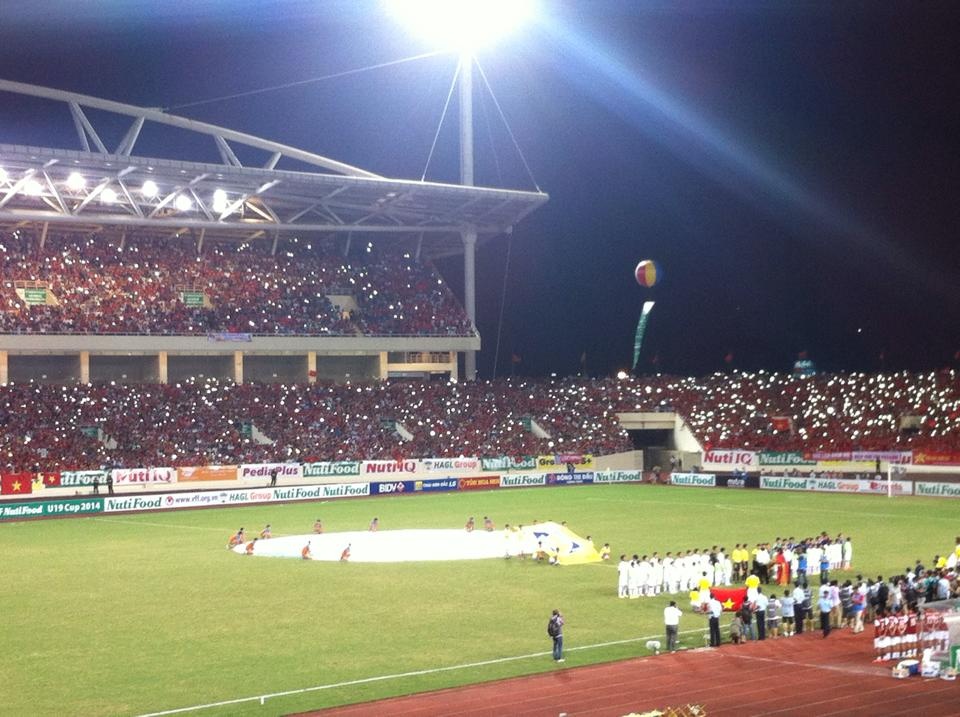 | Khi hai đội U19 Việt Nam và U19 Nhật Bản bước ra sân chuẩn bị làm lễ chào cờ, đồng loạt người hâm mộ trên các khán đài bật đèn flash điện thoại chiếu xuống sân tạo nên một cảnh tượng lung linh. |