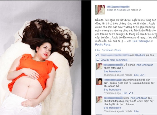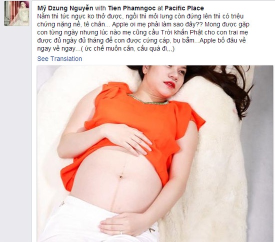 "Apple ơi mẹ phải làm sao đây? Mong được gặp con từng ngày nhưng lúc nào mẹ cũng cầu trời khấn Phật cho con trai mẹ được đủ ngày đủ tháng để con được cứng cáp, bụ bẫm", cô viết trong phần chú thích tấm ảnh mang bầu.