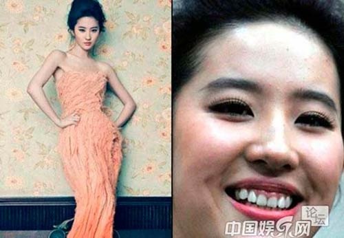 Lưu Diệc Phi luôn được ngưỡng mộ bởi nhan sắc thiên thần. Thực tế, nhan sắc của cô chưa thực sự hoàn hảo bởi nụ cười hở lợi và làn da không "bóng loáng" như trong các bộ ảnh. |