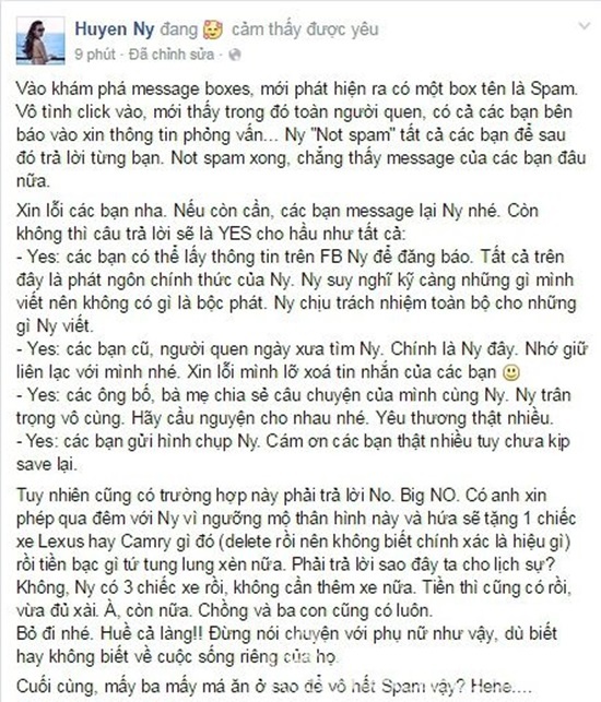 Chia sẻ về vấn đề này, Huyền Ny cho biết: ''Tôi vẫn thường nhận được một vài tin nhắn tương tự như thế. Tôi chỉ phớt lờ thôi. Tôi cũng không thể điều khiển được sở thích của người khác mà chỉ sống sao để không hổ thẹn với lương tâm, không ảnh hưởng tới gia đình và không đi quá giới hạn giữa người của công chúng với khán giả hâm mộ''. Cô cũng mong tất cả mọi người nên cảnh giác trong việc chia sẻ thông tin về cuộc sống cá nhân trên mạng xã hội vì đây là vấn nạn chung mà ai cũng có thể gặp phải, chứ không riêng người nổi tiếng.