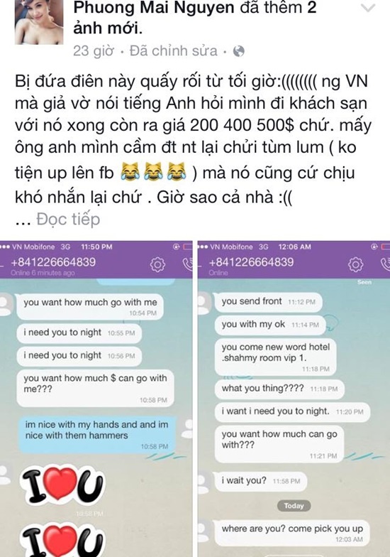 | Dương Hoàng Yến đã không giấu được sự bực tức khi cho biết: "Sáng sớm mở mắt ra đã bị gạ gẫm. Mình chân có dài đâu, cộng cả 3 khúc vào đc có gần 1,6m. Bây giờ dễ kiếm tiền nhỉ. Mình cũng thích Lv, cũng thích đồ make up nhưng mình thích tự mua hoặc bạn thân mua cho hơn. Anh này bị ảo tưởng sức mạnh và coi thường nghệ sĩ chúng em quá!". Cô cũng cho biết đây không phải là lần đầu tiên mình rơi vào trường hợp này khi từng có những người quen biết mình đưa ra những lời đề nghị như vậy. |