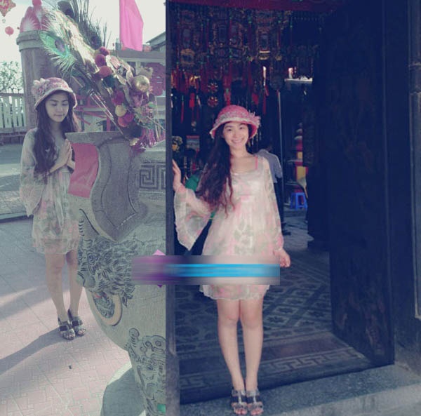 | Lương Bích Hữu mặc váy mỏng manh, vô tư tạo dáng trước của chùa. |