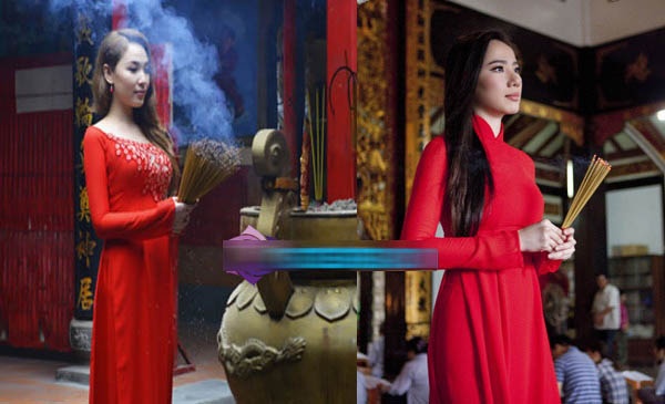 | Chọn trang phục màu đỏ, Quỳnh Thư và Chung Thục Quyên nổi bật giữ chốn thiêng liêng. |