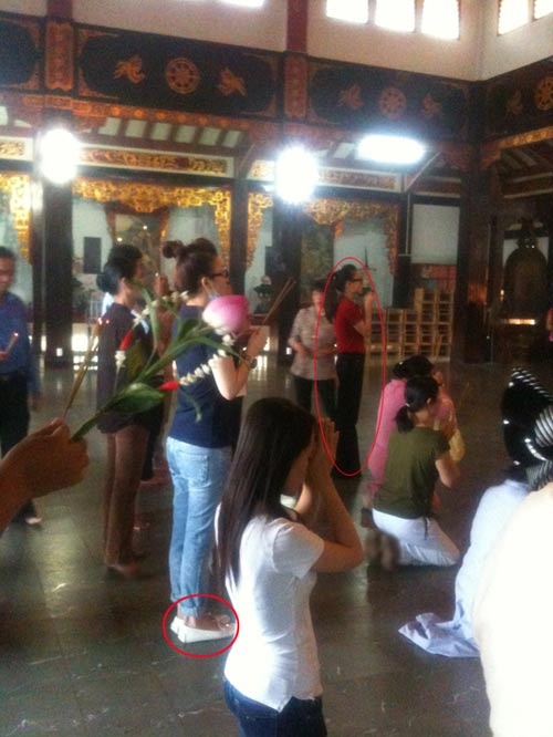 | Yến Trang và Yến Nhi mặc quần jeans, áo thun kín đáo nhưng lại bị chỉ trích vì mang giày vào trong chùa. |