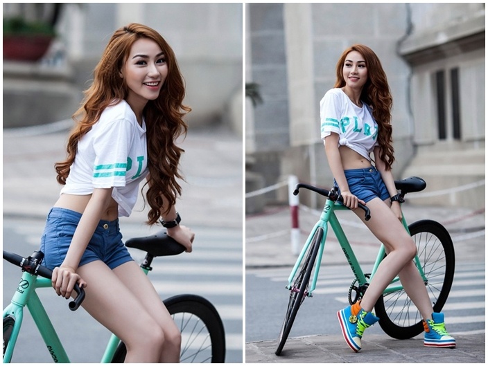 Ngoài thân hình mảnh mai đạt chuẩn quốc tế, Hoàng Thùy còn sở hữu một vòng eo thon gọn hiếm có. Trong trang phục thể thao, ưu thế của người mẫu tiếp tục được phát huy.