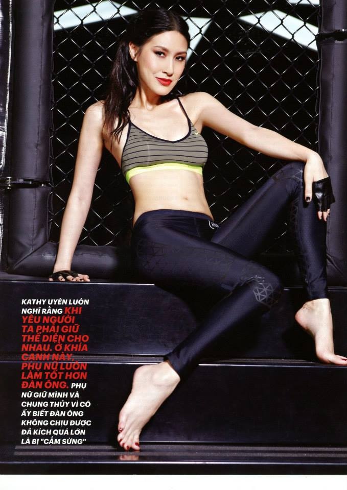 Diễn viên Kathy Uyên cũng có được số đo hoàn chỉnh khi cô diện trang phục thể thao. Kiểu áo croptop giúp người đẹp phát huy lợi thế vóc dáng thanh mảnh.
