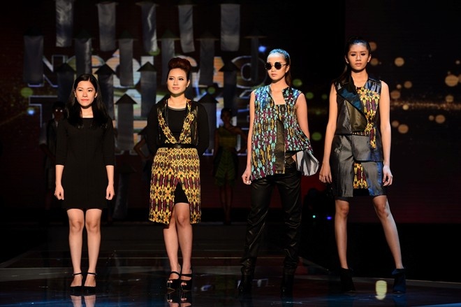 Ốc Thanh Vân cũng lọt thỏm giữa hai người mẫu Tô Uyên Khánh Ngọc và Thùy Linh khi cả 3 cùng sải bước catwalk.