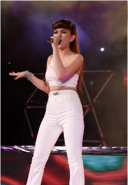 | Một hình ảnh kém duyên của nữ ca sĩ Hoàng Thùy Linh vốn nổi tiếng với phong cách nóng bỏng. Chiếc áo buộc vạt khoe eo trở thành "tội đồ" khi vòng hai của cô đầy mỡ. |