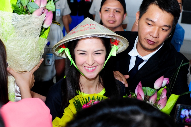 | Marian xinh tươi khi đội nón lá Việt Nam tại sân bay. Nữ diễn viên thu hút mọi ánh nhìn bởi vẻ đẹp ngọt ngào, nữ tính nhưng không kém phần quyến rũ. |