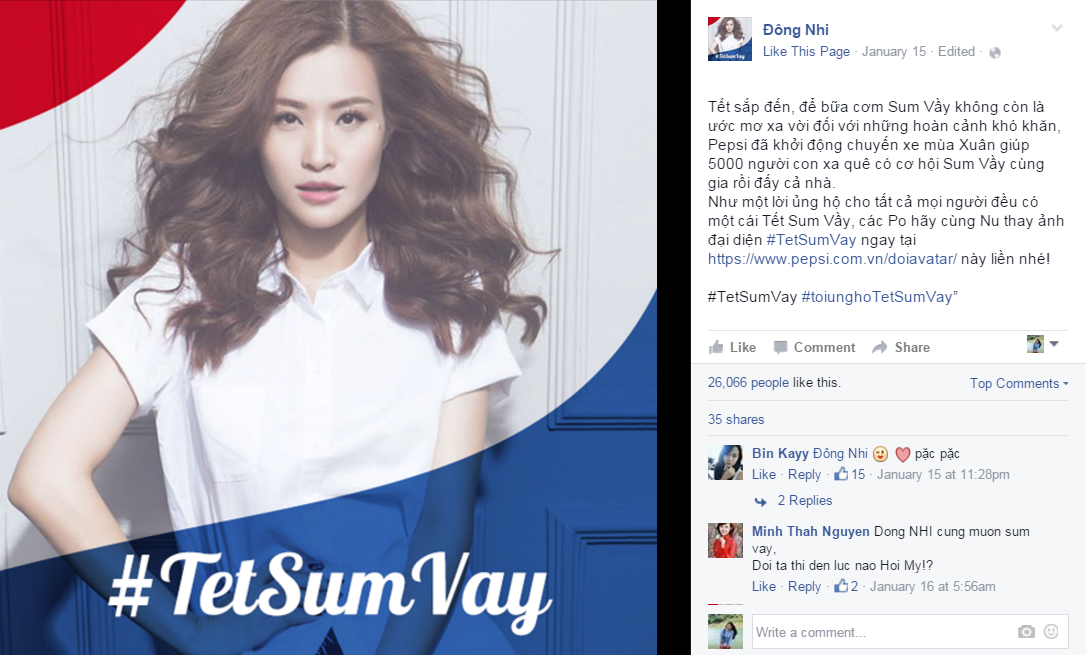 Độc giả có thể thay đổi ảnh đại diện với hashtag “Tết sum vầy” tại đây để ủng hộ 5.000 ước mơ đoàn viên được hiện thực hóa trong Tết Bính Thân. Đây là chương trình cho nhãn Pepsi thuộc Công ty TNHH Nước giải khát Suntory PepsiCo Việt Nam tổ chức từ ngày 18/12/2015 đến ngày 31/1/2016. Bạn đọc tìm hiểu thông tin chi tiết tại website www.tetsumvay.vn.