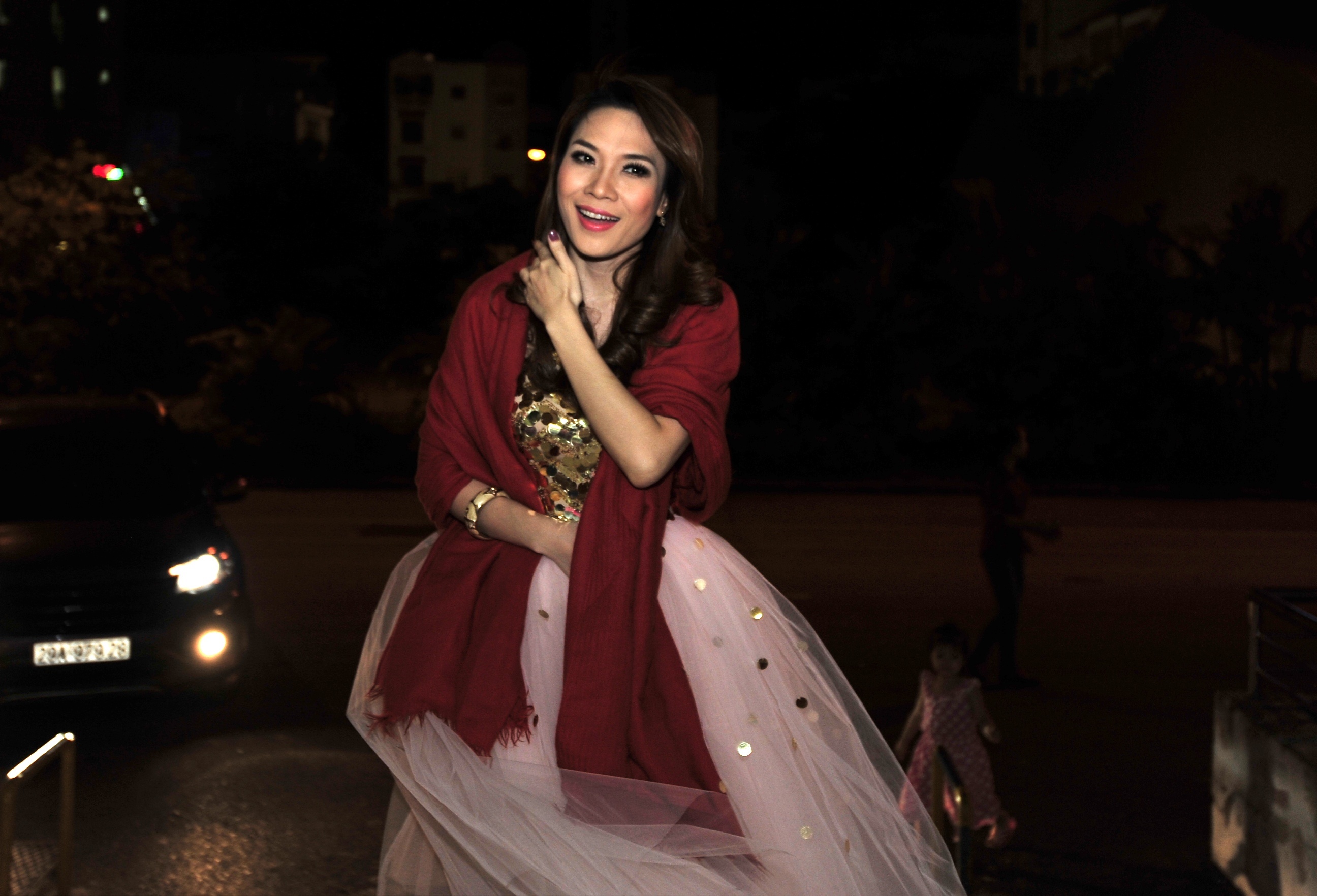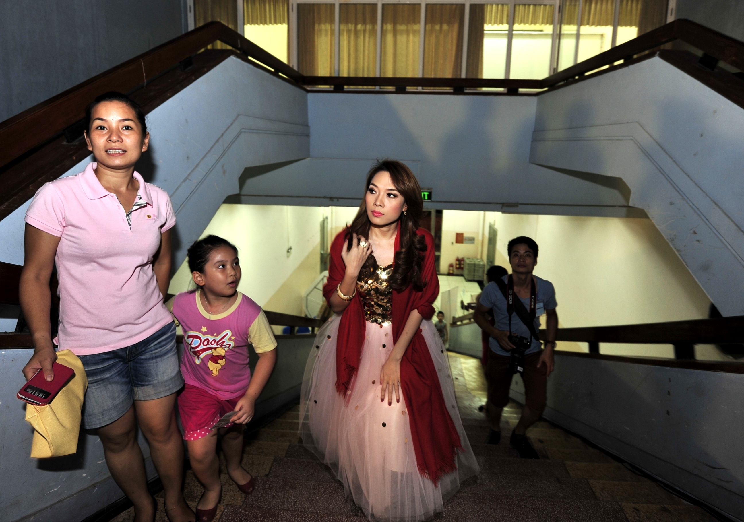 | Chọn cho mình một chiếc váy quây, chân xoè bồng bềnh kiểu dáng công chúa để phù hợp với một chương trình dành cho thiếu nhi, Mỹ Tâm cẩn thận khoác khăn choàng bên ngoài. Cô nhanh chóng di chuyển vào bên trong phòng trang điểm để chuẩn bị cho buổi truyền hình trực tiếp của Đồ Rê Mí. |