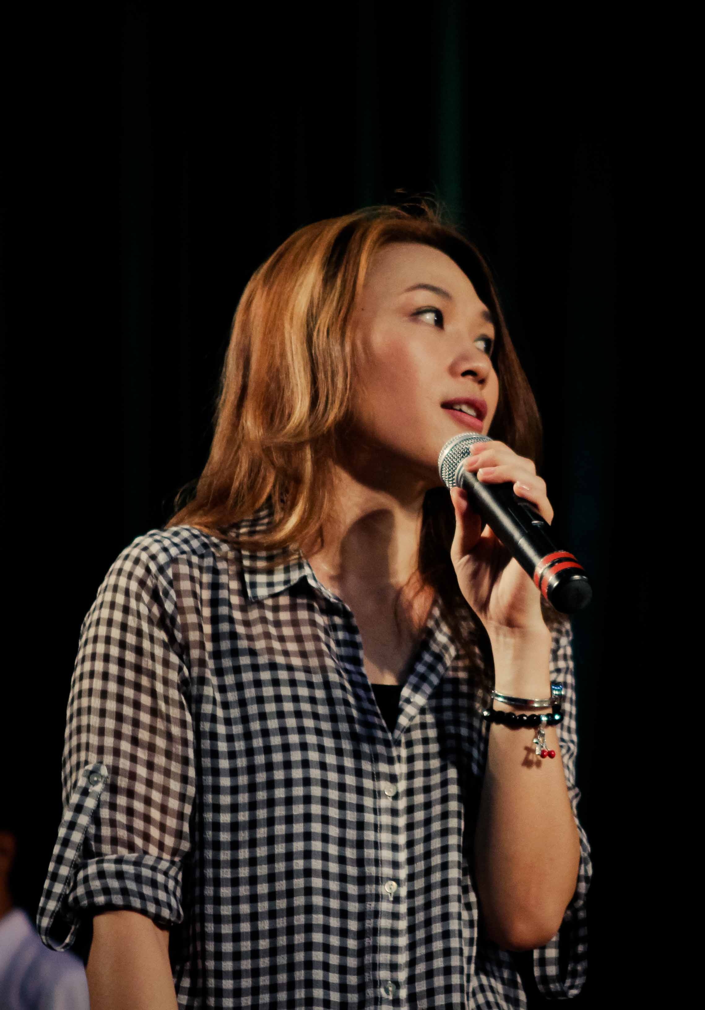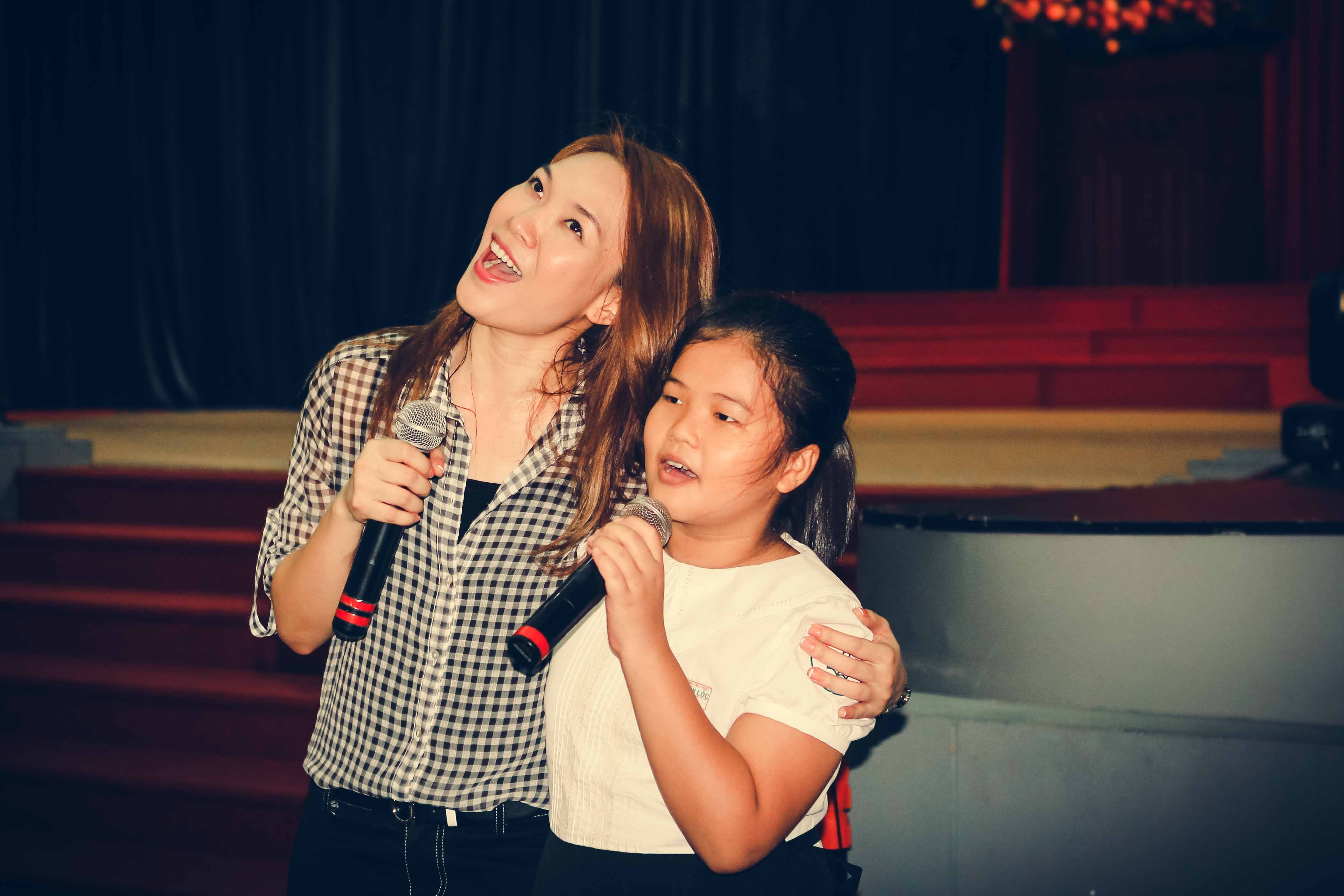 | Có lúc, nữ ca sĩ thả hồn vào các bài hát thiếu nhi khi hát cùng các em. |