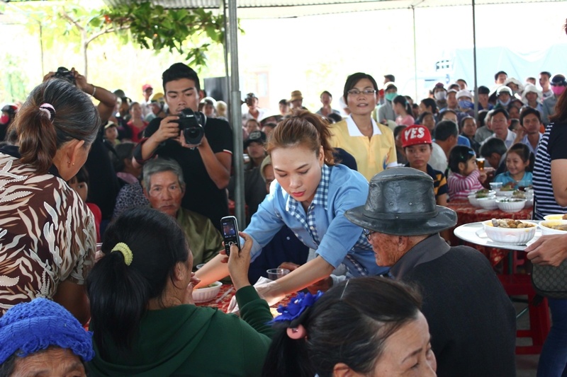 Bàn tay vừa thoăn thoắt làm việc, cô không quên hỏi thăm và động viên từng người. Khi được bà con yêu cầu hát, cô không từ chối mà chạy ngay lên sân khấu đơn sơ gần đó để trình diễn, rồi ngay sau đó lại xuống phía dưới để tiếp tục làm đầu bếp.