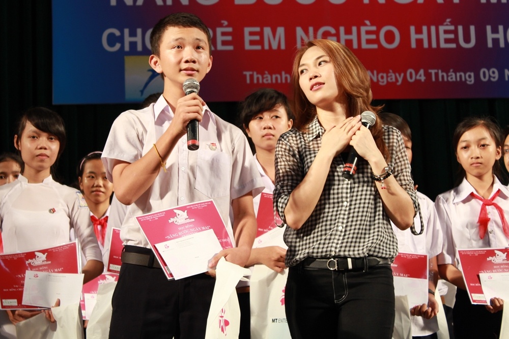 Lần này, 400 em học sinh nghèo hiếu học tại 4 tỉnh thành Quảng Bình, Quảng Trị, Thừa Thiên Huế và Đà Nẵng đã được tận tay nữ ca sĩ trao những phần học bổng vừa mang tính khích lệ tinh thần, vừa giúp các em có thêm chi phí trang trải cho việc học trong năm mới sắp đến.