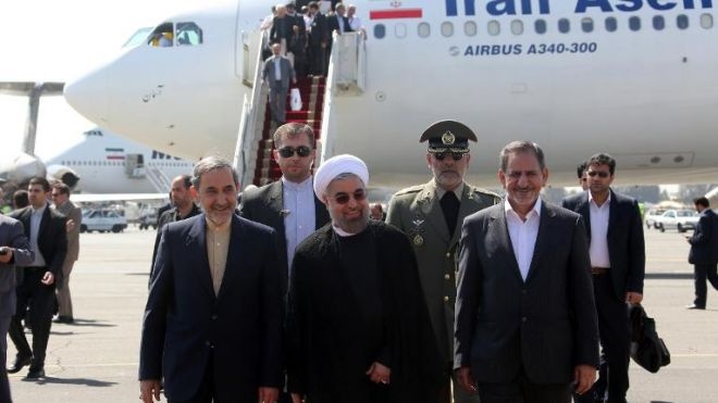 | Tổng thống Iran, ông Hassan Rouhani (đội khăn trắng) cùng các quan chức xuống máy bay tại phi trường Mehrabad ở thành phố Tehran sau khi trở về từ Mỹ vào ngày 28/9. Ảnh: AFP. |