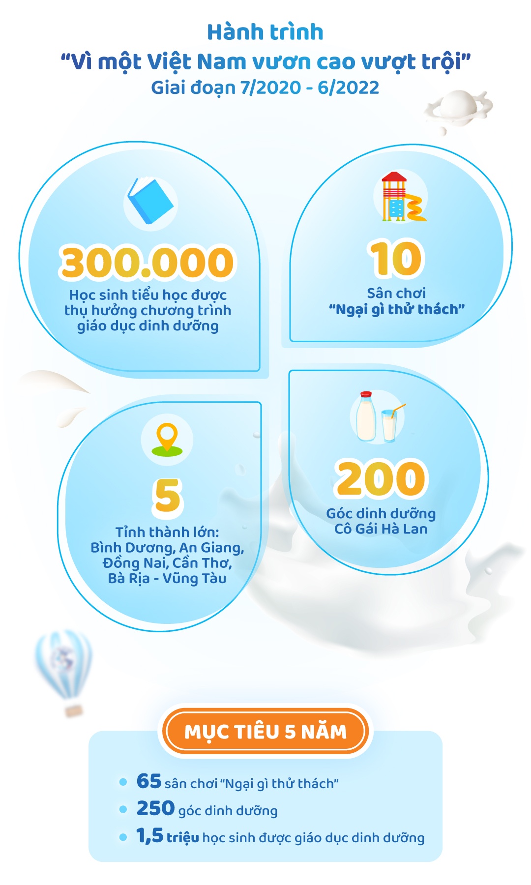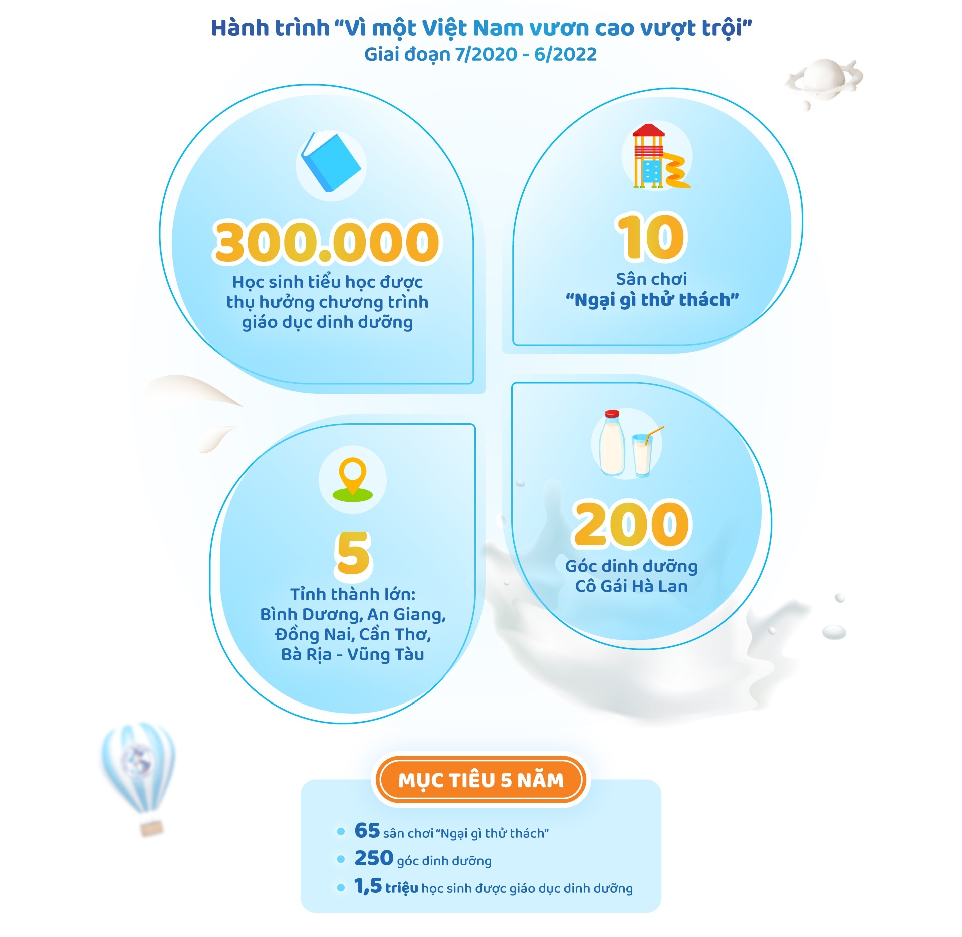 Nỗ lực cải thiện không gian vận động cho trẻ em Việt Nam trong hai năm đại dịch là dự án nhiều tâm sức của Cô Gái Hà Lan. Từ 2020, nhãn sữa hợp tác Bộ Giáo dục và Đào tạo thực hiện chương trình 5 năm “Vì một Việt Nam vươn cao vượt trội”, với tổng đầu tư đến 55 tỷ đồng. Đây là chiến lược nổi bật hướng đến mục tiêu phát triển bền vững của Tập đoàn FrieslandCampina Việt Nam cũng như Cô Gái Hà Lan.