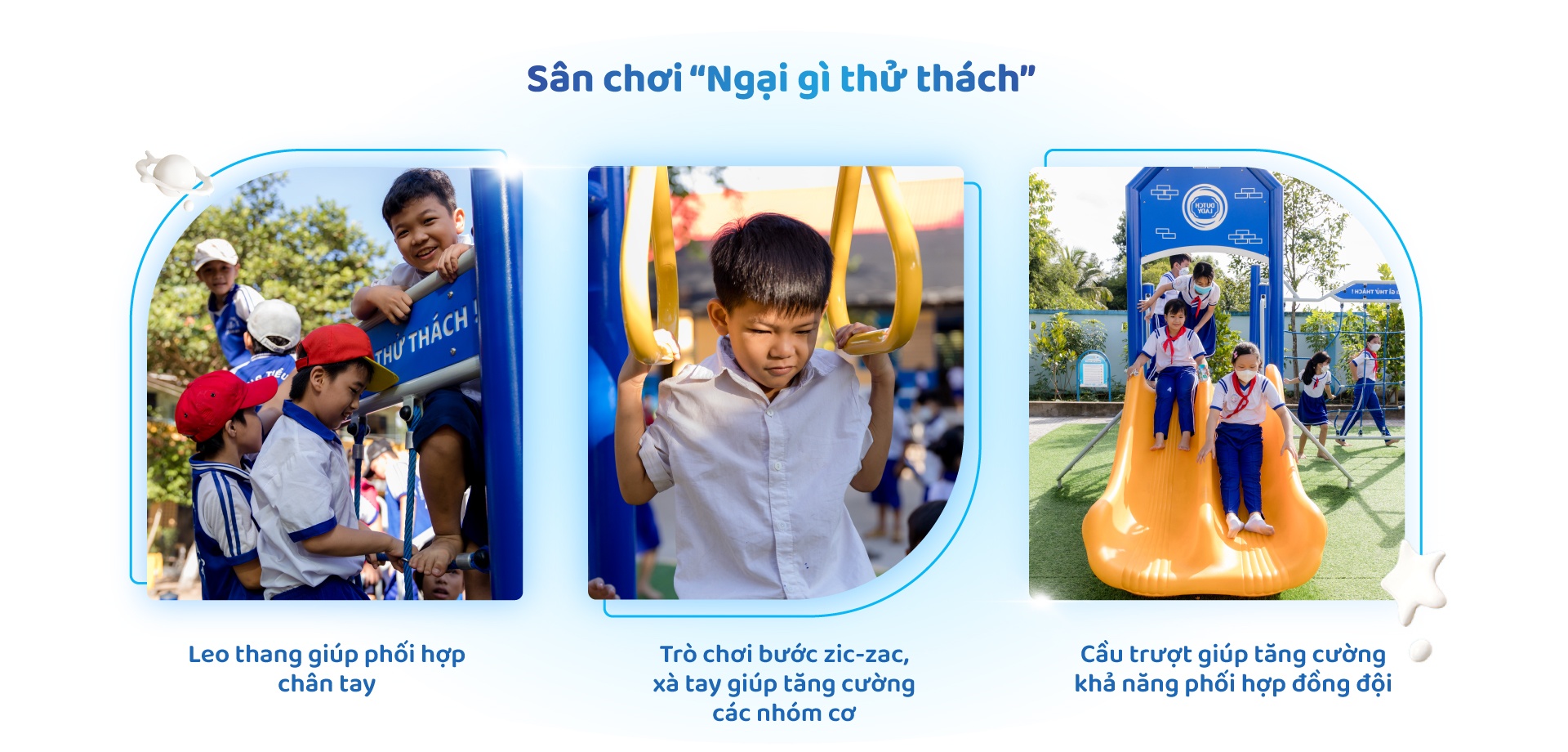 Được thiết kế phù hợp thể chất học sinh tiểu học Việt Nam, sân chơi là chuỗi vận động mô phỏng hành trình vượt thử thách với kết cấu, chất liệu an toàn, góp phần mang đến những giờ ra chơi giàu cảm hứng cho các em.