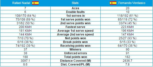 Nhiều hơn đối thủ 3 tuổi, Verdasco vẫn khiến tất cả nể phục bằng sự dẻo dai đáng ngạc nhiên. Suốt gần 5 tiếng tranh tài, tay vợt hiện xếp hạng 45 thế giới thi đấu nhiệt huyết và rất chủ động trong những pha tấn công dù bên phần sân đối diện, Nadal vốn nổi tiếng với lối đánh bền bỉ.