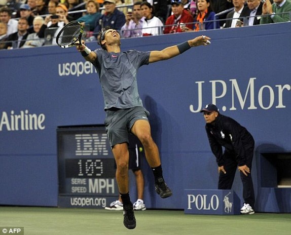 | Nadal ăn mừng sau khi đánh bại Djokovic ở set 4. Đây là chiến thắng thứ 22 liên tiếp của Nadal trên mặt sân cứng. |