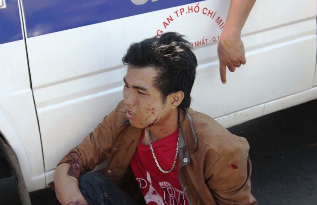 Cú tông rất mạnh khiến anh Tính ngã xuống đường, bị thương nguy kịch, được người dân chở đi cấp cứu; còn Mì chỉ bị thương nhẹ.