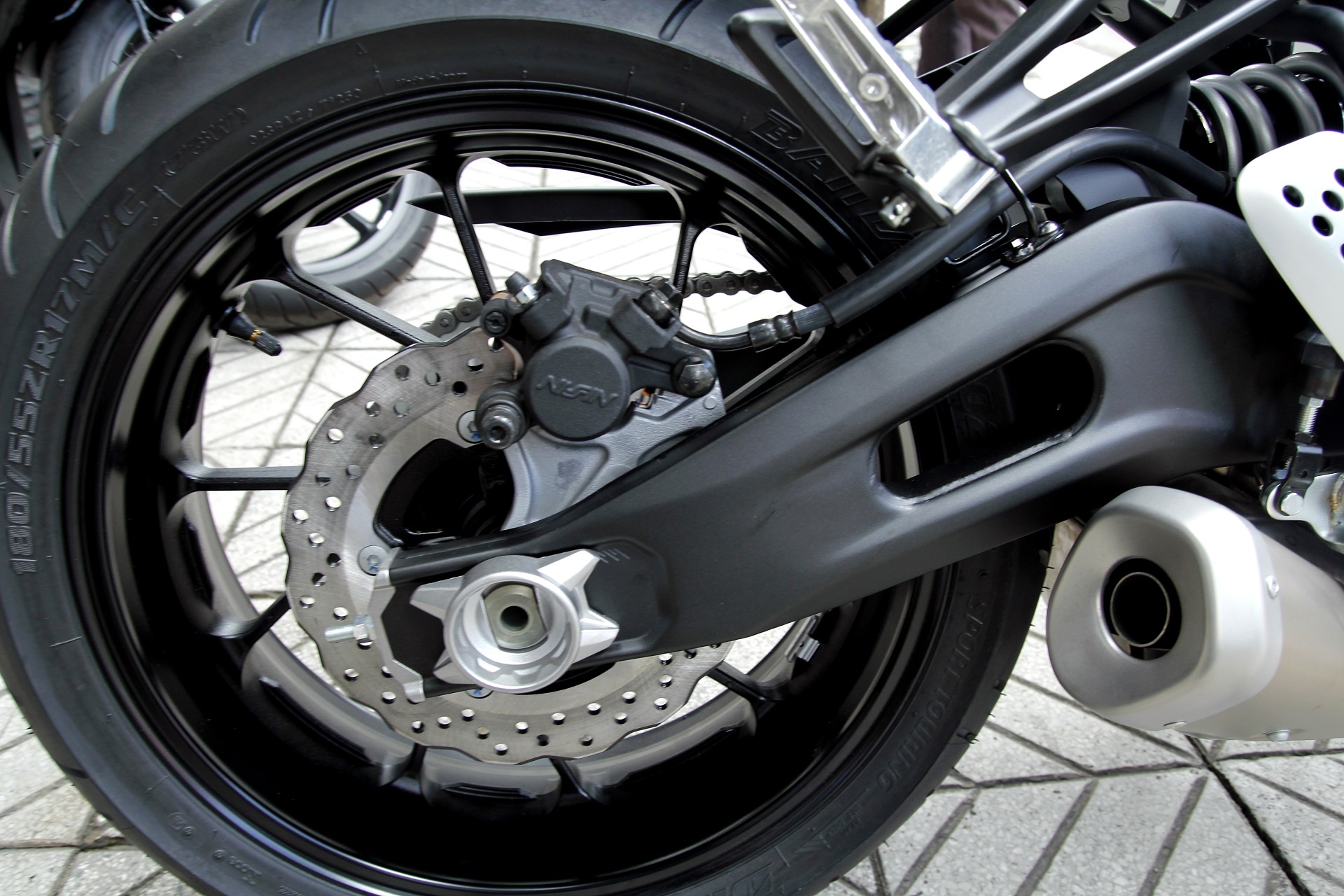 | Xe sử dụng gắp đôi bằng nhôm, sơn đen mờ. Lốp sau kích thước 180/55ZR-17 nhằm đảm bảo độ cân bằng khi vào cua tốc độ cao. |