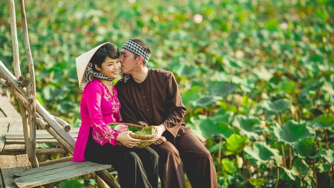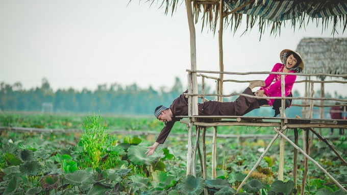 Và đây, mời bạn cùng ngắm nhìn nhìn đôi uyên ương Nhật Bản trông rất Việt Nam trên đồng lúa vàng, đồng sen thơm ngát rực thắm và trong trang phục cũng rất Việt Nam - khăn rằn và bộ quần áo bà ba. Bộ ảnh cưới của họ thật lộng lẫy không chỉ bởi thiên nhiên đồng quê Việt Nam đẹp rạng ngời, mà bởi cách thể hiện rất dung dị, rất đời thường của họ toát lên cái đẹp của hạnh phúc đơn sơ của đôi vợ chồng nhà quê vui cùng rổ khoai, bó sen, xuồng ba lá, thú vui câu cá...