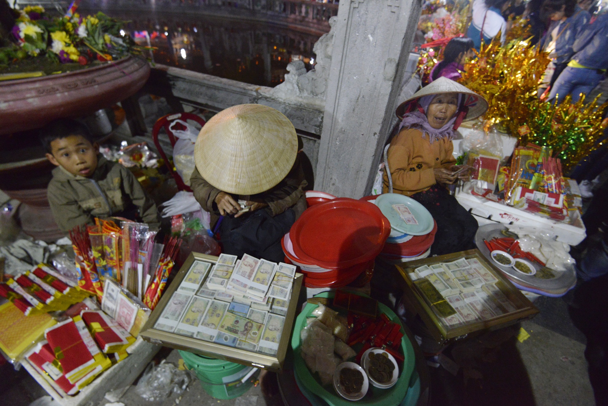 | Dịch vụ đổi tiền lẻ chênh lệch cao xuất hiện ngay trước phủ chính đền Thượng. |