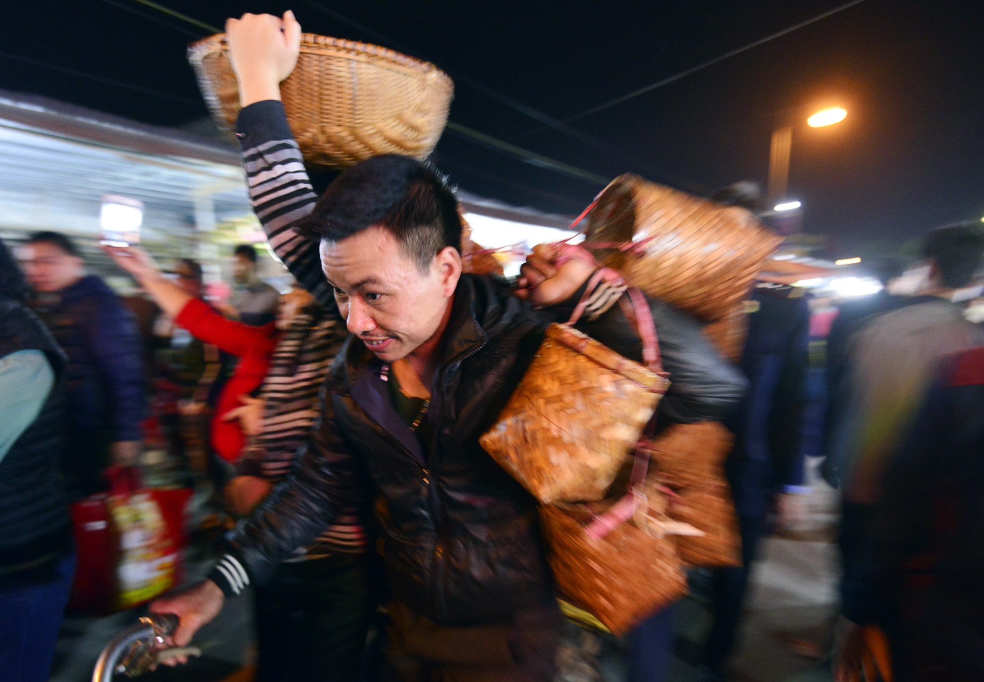 | Tại khu vực chợ Viềng xuân, cảnh tượng mua bán đông đúc. Người đàn ông này mua nhiều chiếc nơm về để lấy may. |