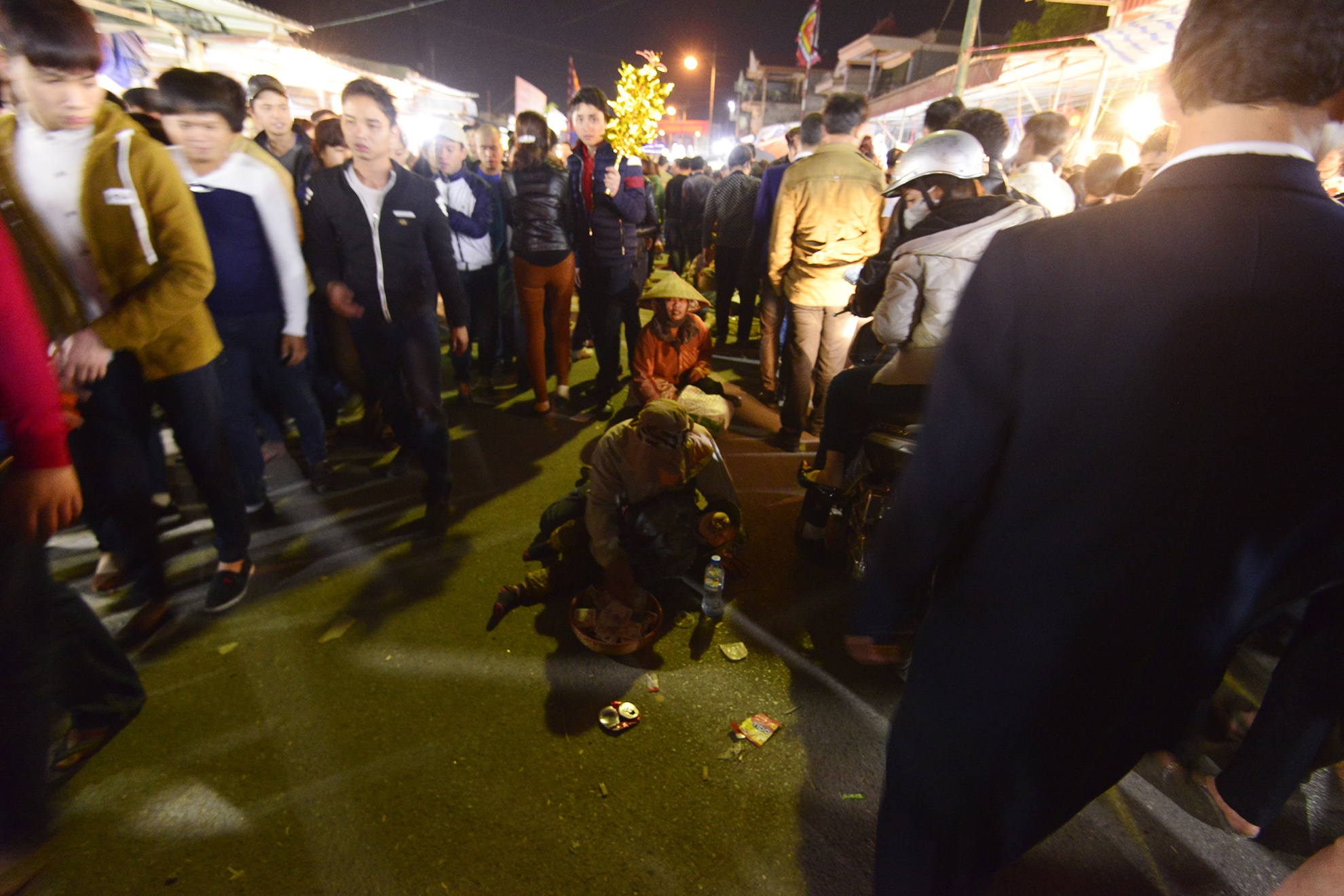 đền Thượng đến phía trong Phủ Dầy, đội quân ăn xin nằm la liệt trên đường với hình ảnh cụt chân, cụt tay hoặc nhiều vết thương tích trên người. Trẻ em cũng bị huy động ra đây cùng ngửa nón xin tiền. |