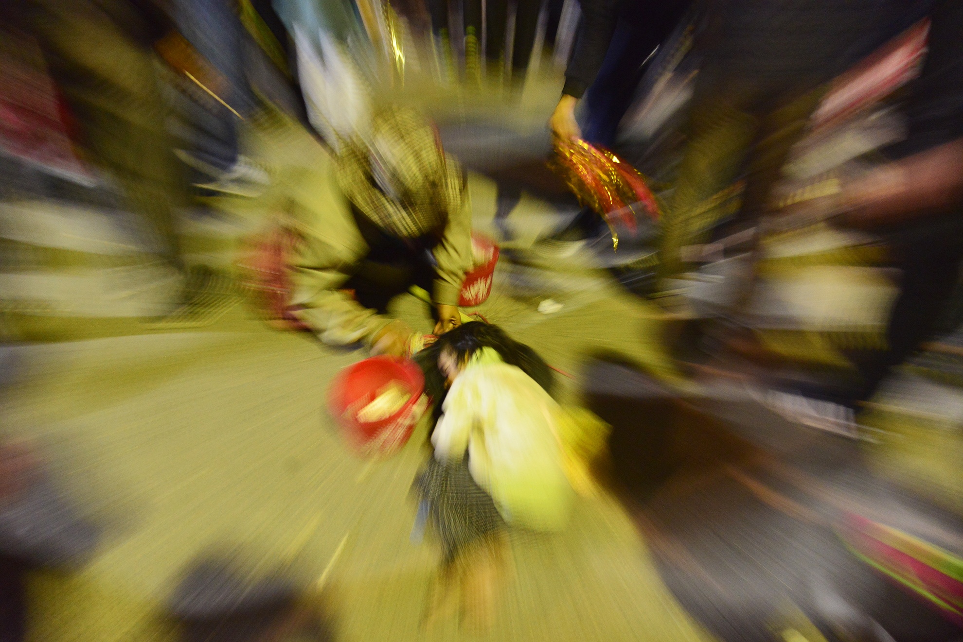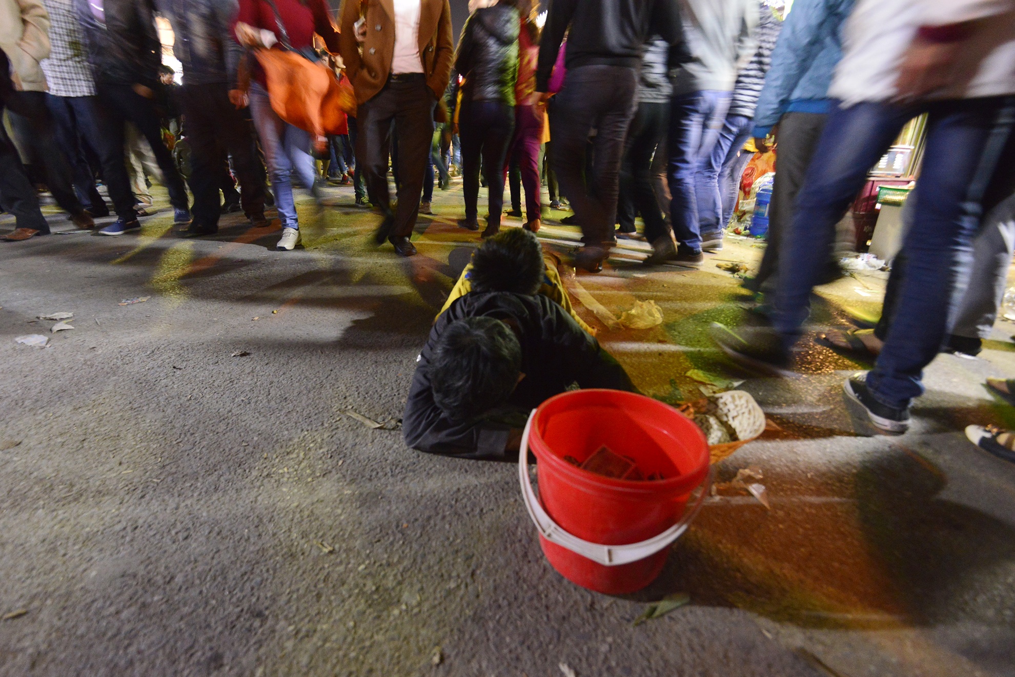 | Nhiều em nhỏ nằm trên đường hàng tiếng đồng hồ mà không mở mắt. Anh Tú, một người dân sống trên con đường này cho biết: "Người lớn tiêm cho chúng thuốc ngủ nó mới ngủ lâu thế, chứ trẻ con vài ba tuổi sao chịu được cảnh chen chúc, lạnh giá trong đêm như vậy". |