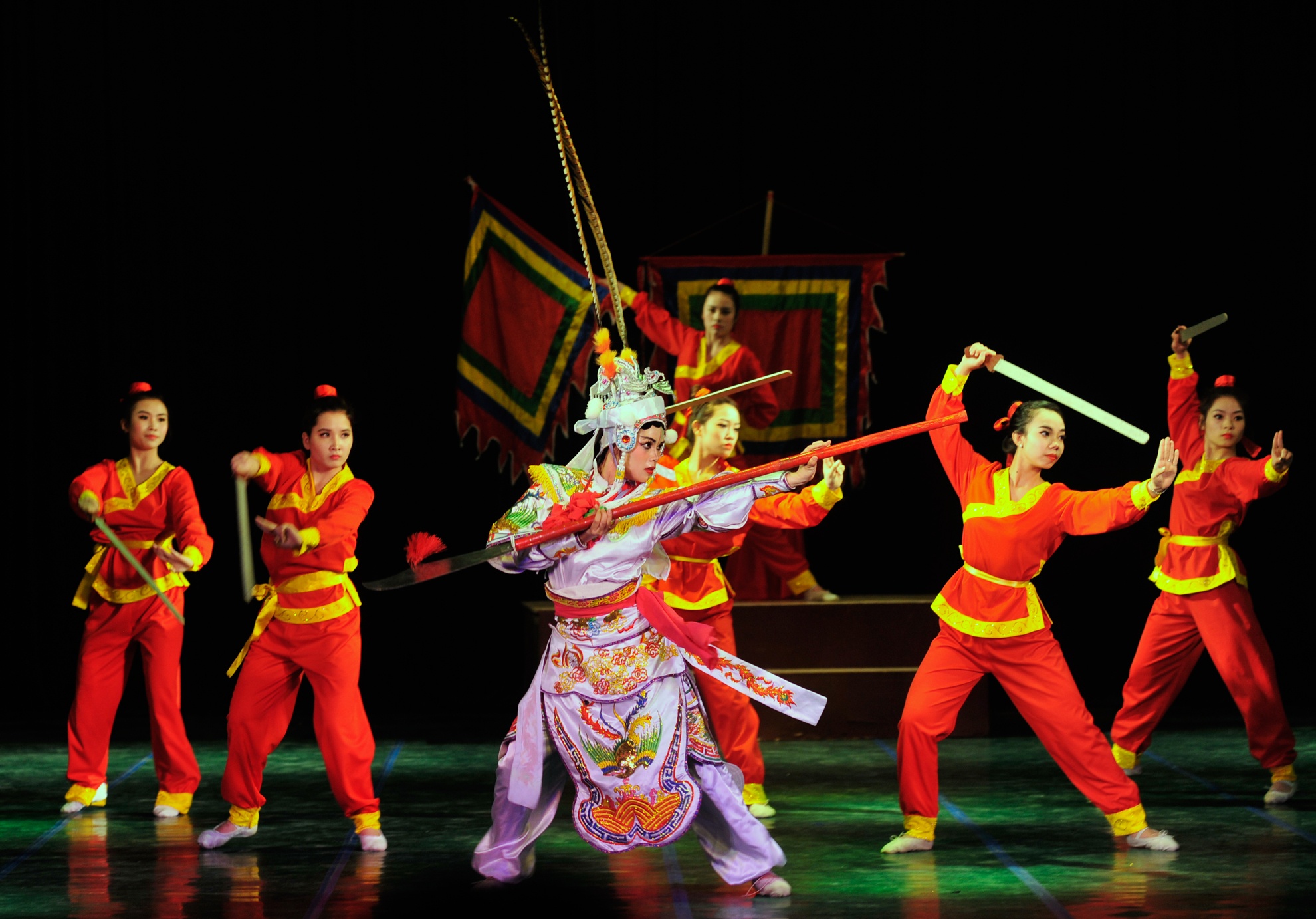 Đêm thi diễn ra khá sinh động với các tác phẩm múa kết hợp với loại hình dân gian như tuồng của Đỗ Thị Bích Hạnh. Trong ảnh là vở Đào Tam Xuân.