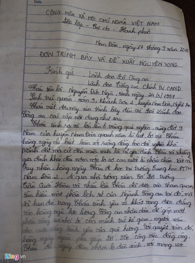 Nguyễn Đức Ngà đã soạn sẵn bức thư 4 trang giấy, là những dòng tâm sự của em khi nhận được thông tin không đủ tiêu chuẩn chính trị vào Học viện Cảnh sát nhân dân.