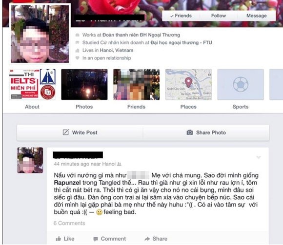 Ngày 18/2/2014, nam sinh có tên L.T.H chia sẻ dòng trạng thái có nội dung như sau: "Nấu với nướng gì mà như … í. Mẹ với cả mung. Sao đời mình giống Rapunzel (công chúa tóc mây) trong Tangled thế. Rau thì già như gì xin lỗi như rau lợn í, tôm thì cắt nát bét ra. Thôi thì có gì ăn vậy cho no cái bụng".
