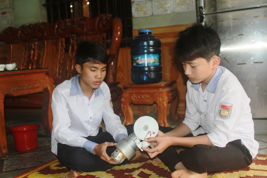 | Thuận và Chính xem lại mô hình máy phát điện bằng năng lượng mặt trời đầu tiên của mình. Ảnh: P.N. |