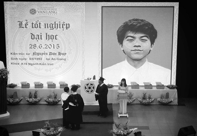 Khi tên của tân kiến trúc sư Nguyễn Đức Huy được xướng lên, hình ảnh của bạn xuất hiện tại màn hình, cả hội trường im lặng đầy trân trọng. Người lên nhận bằng là đại diện của gia đình - ba của bạn Huy. Giây phút ông nhận tấm bằng từ trường, nhận lời chia buồn sâu sắc từ thầy hiệu trưởng đầy quyến luyến và bịn rịn, cả hội trường nhiều bạn không cầm được nước mắt vì hình ảnh cảm động này.