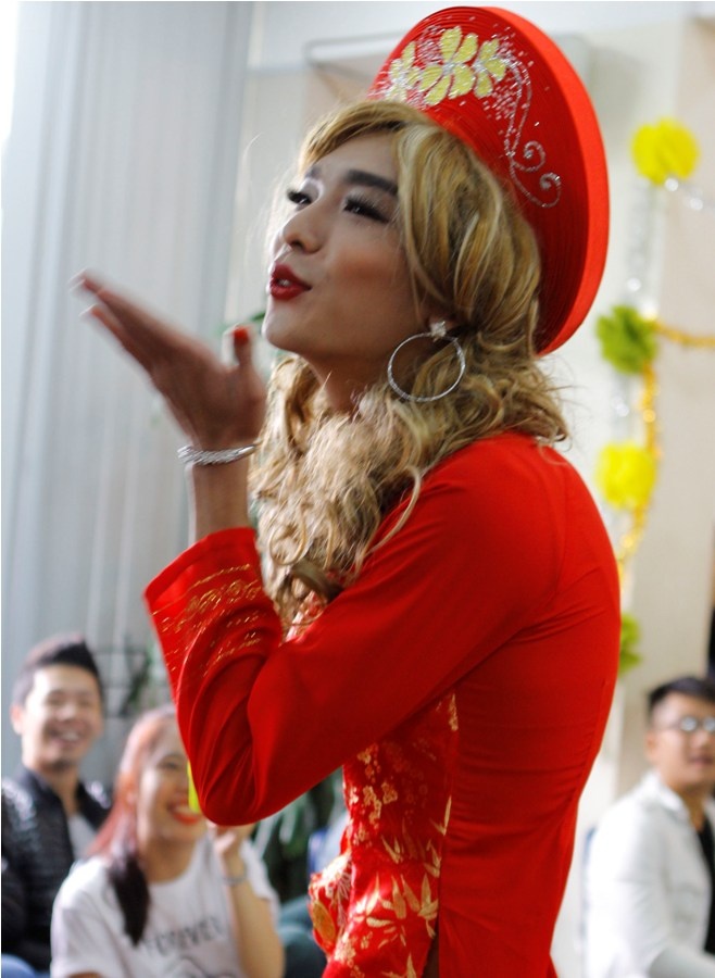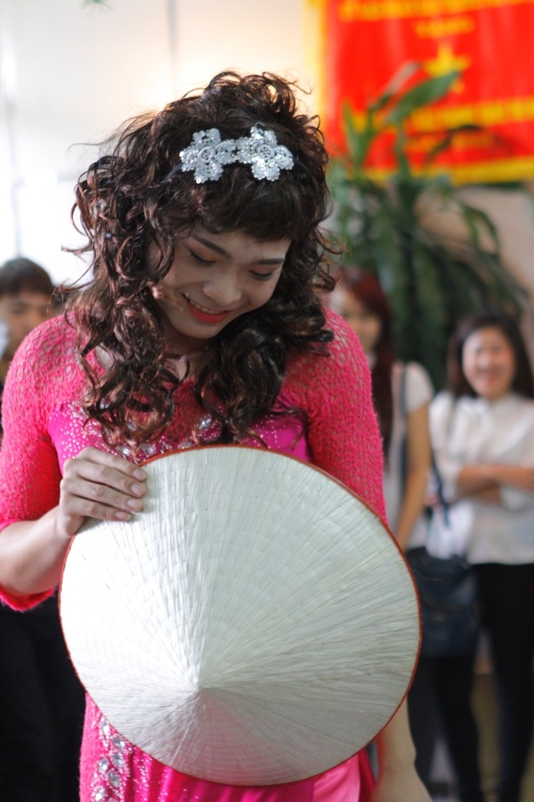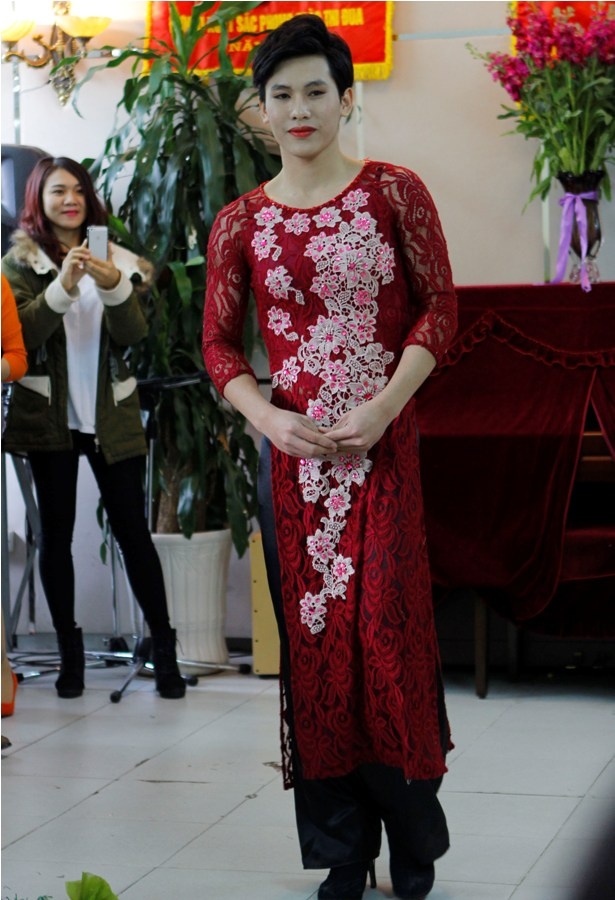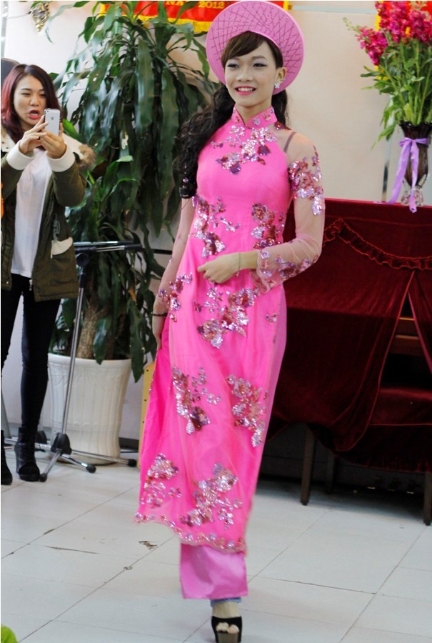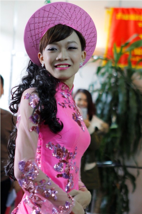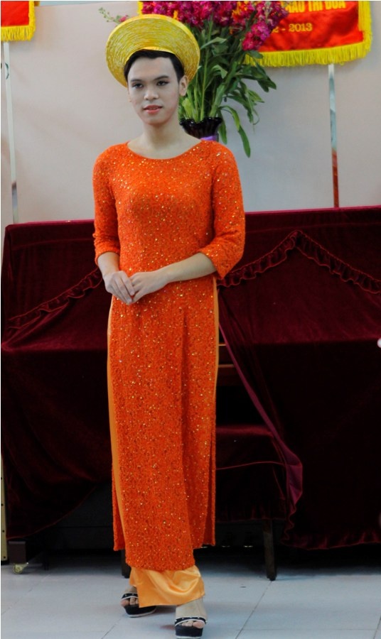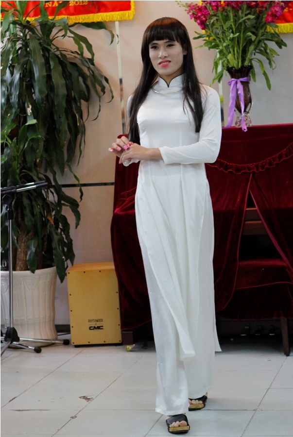 | Một nam sinh giả gái mặc áo dài rất xinh xắn. |