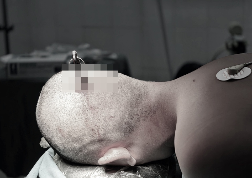 Bệnh nhi nhập viện trong tình trạng có vết thương vùng đỉnh chẩm, kèm theo dị vật là một chiếc chìa khóa cắm sâu tại vị trí tổn thương. |