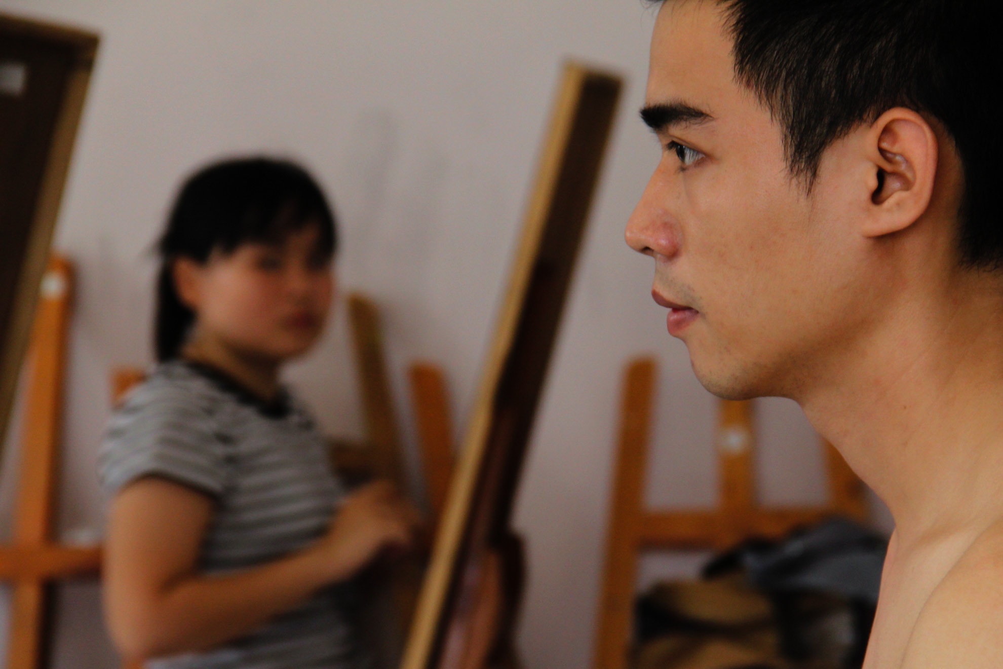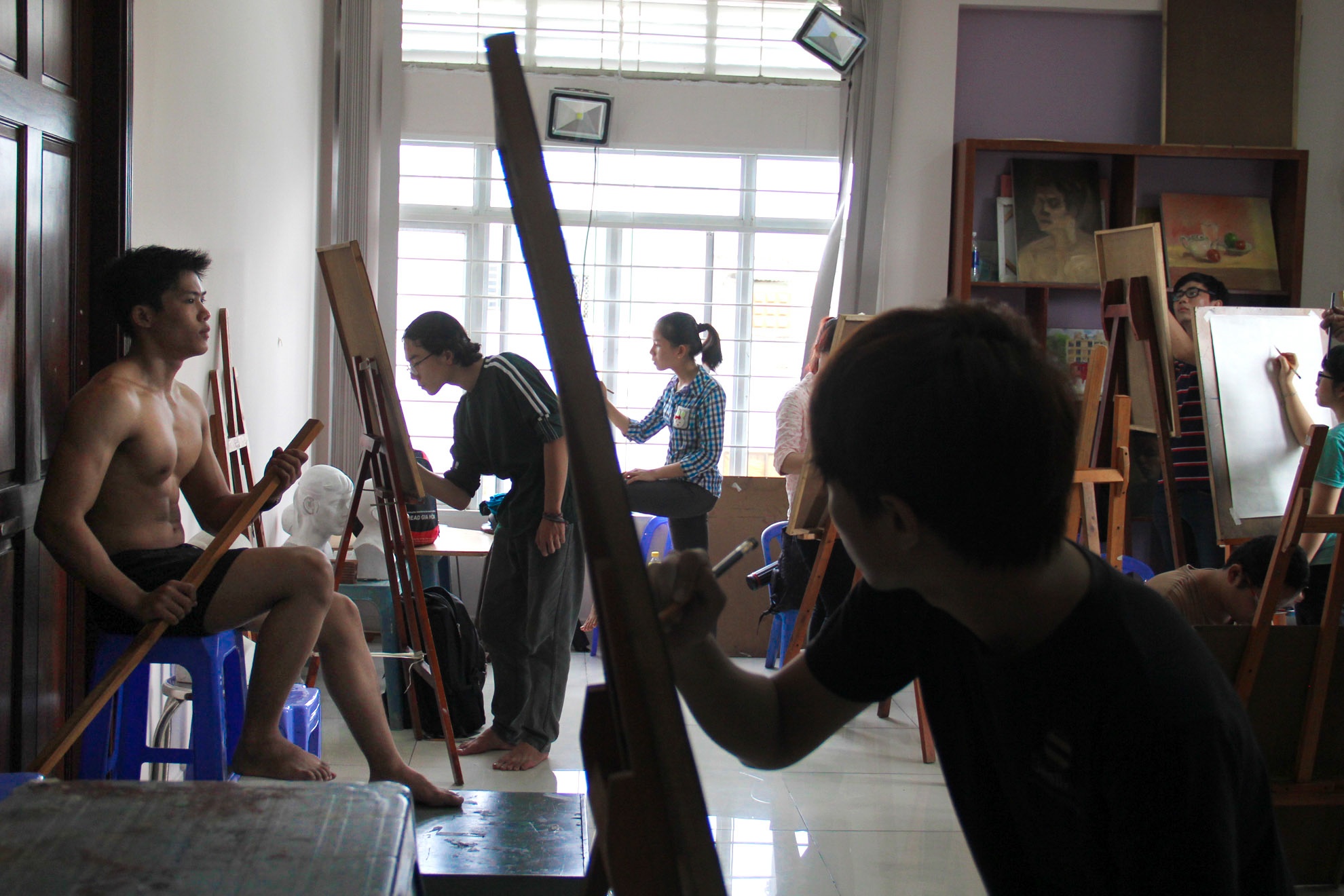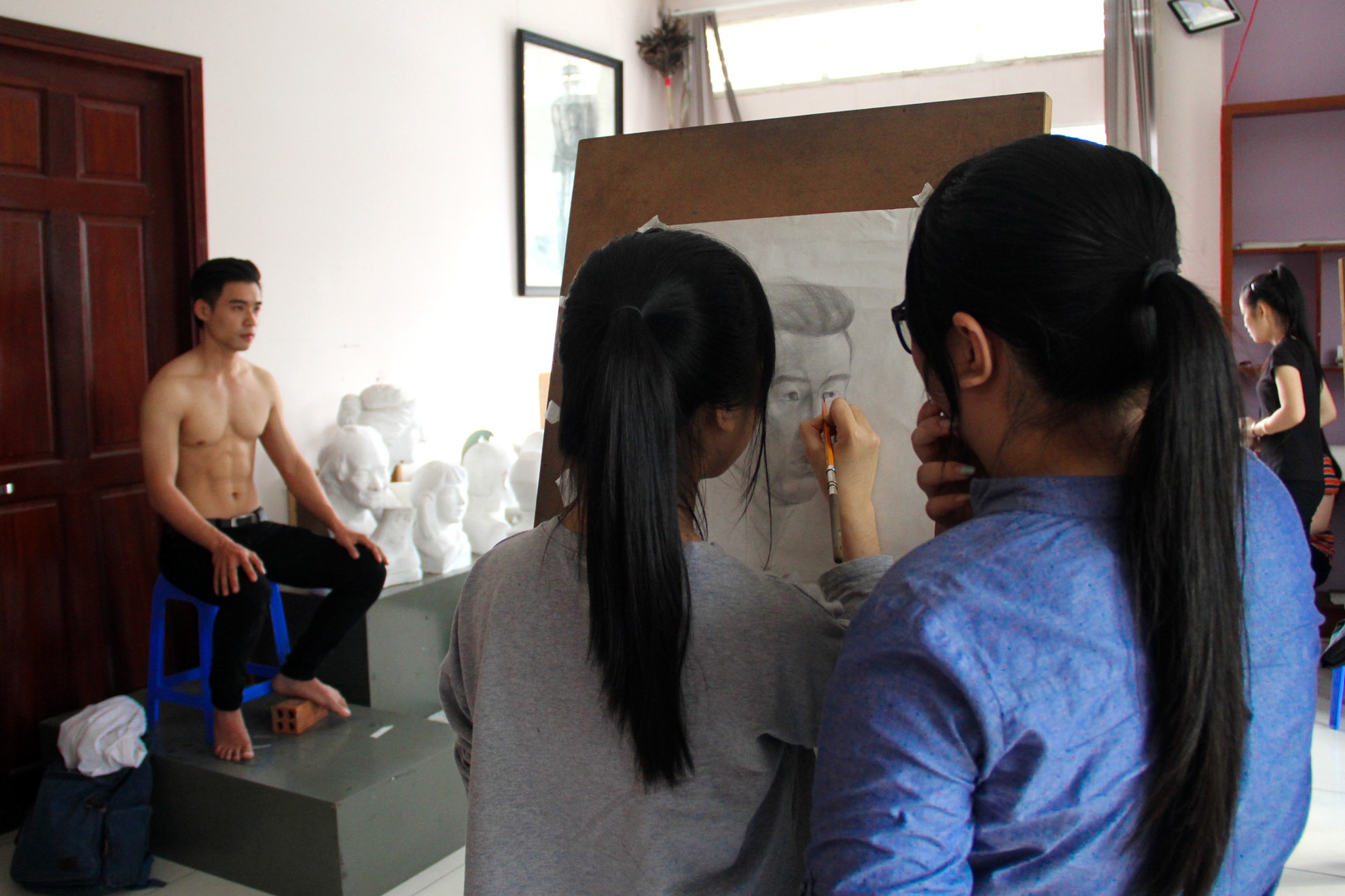 Duy và Nam là hai trong số nhiều chàng trai hàng ngày cởi trần ngồi không cử động cho các bạn trẻ luyện thi đại học tập vẽ chân dung tại lớp hội họa ở TP HCM.