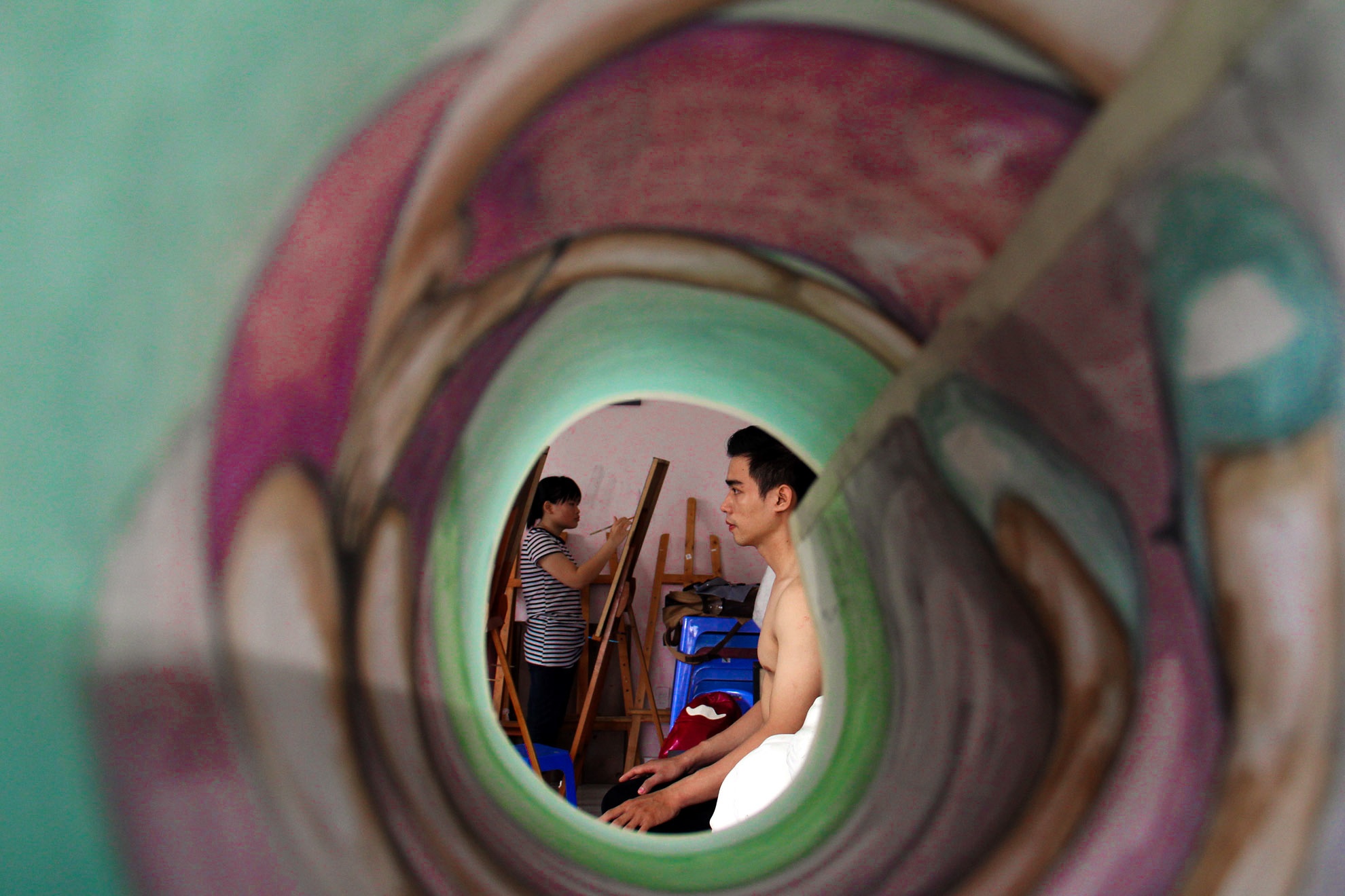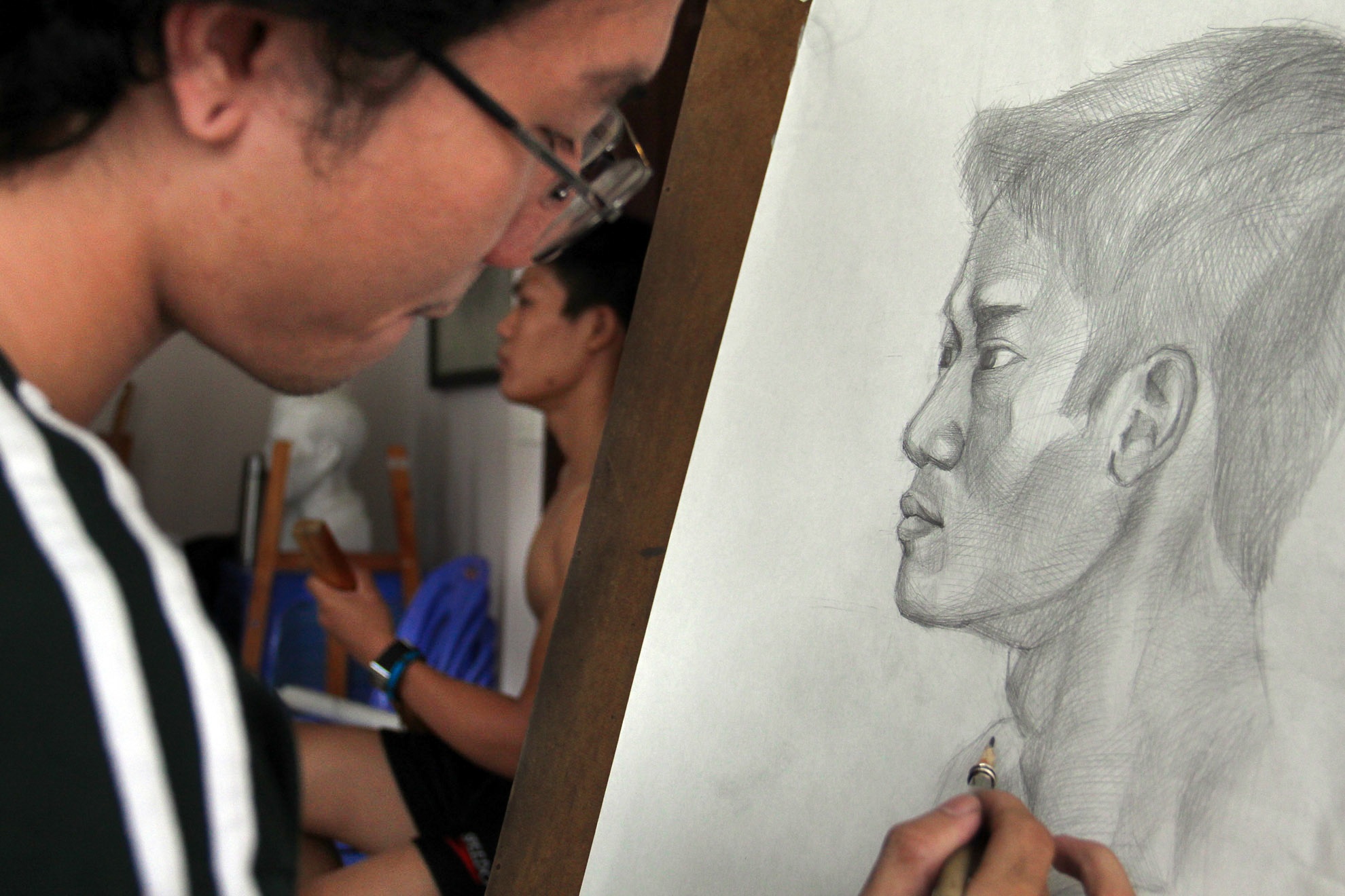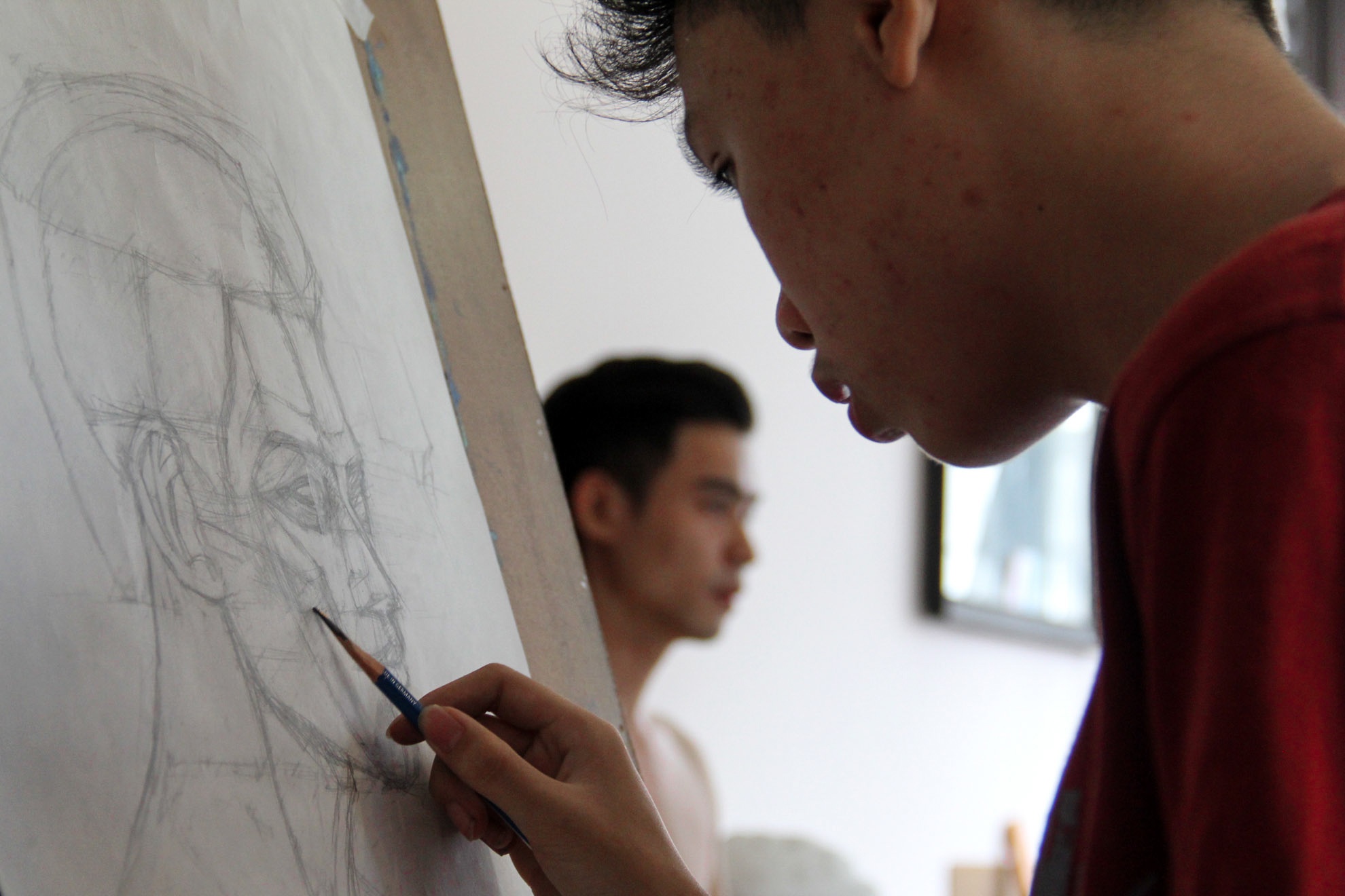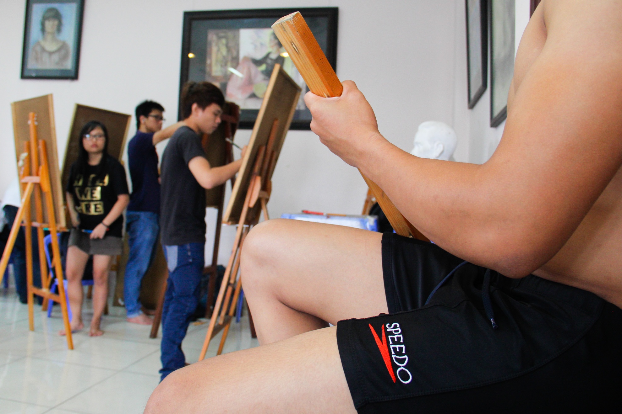 Duy và Nam là hai trong số nhiều chàng trai hàng ngày cởi trần ngồi không cử động cho các bạn trẻ luyện thi đại học tập vẽ chân dung tại lớp hội họa ở TP HCM.