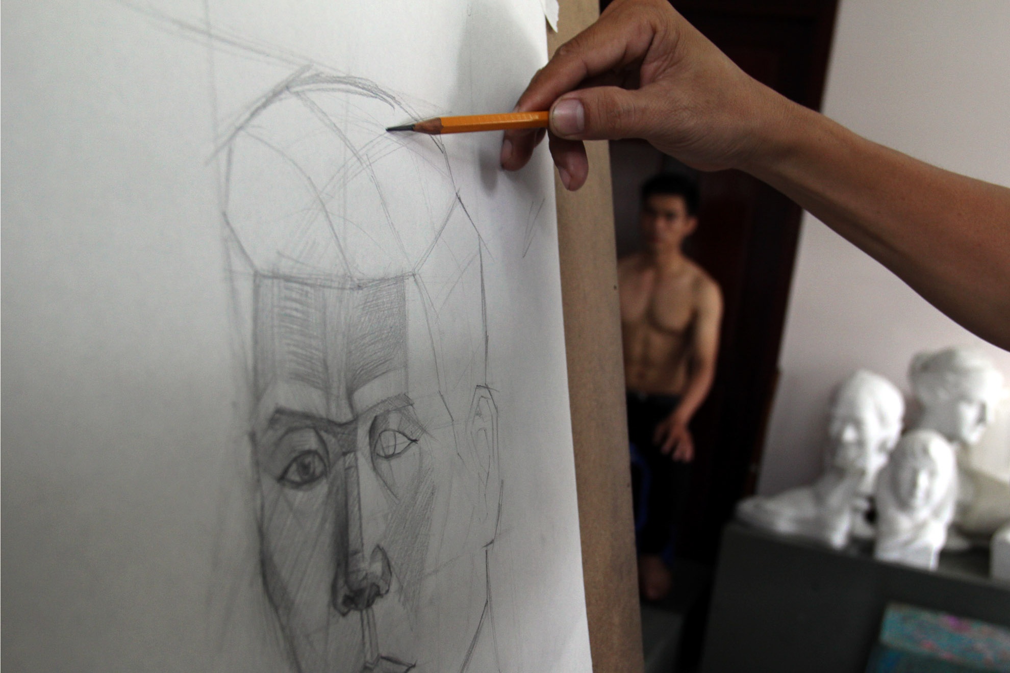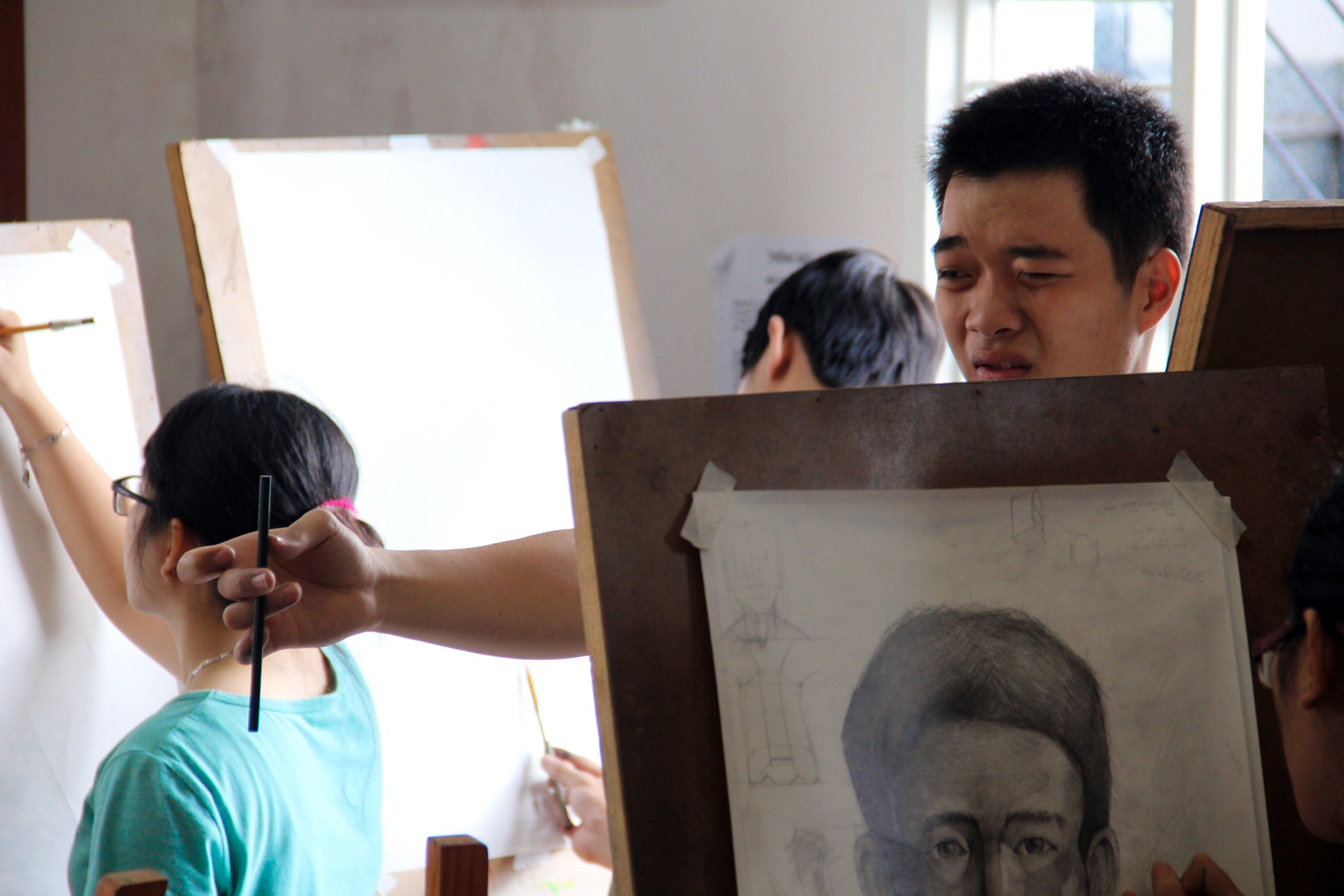 Ở một lớp luyện thi khác, Đặng Tiến An (sinh năm 1995) - sinh viên Khoa Mỹ thuật Công nghiệp - cũng chọn việc ngồi làm mẫu cho thí sinh luyện thi đại học để kiếm thêm thu nhập.