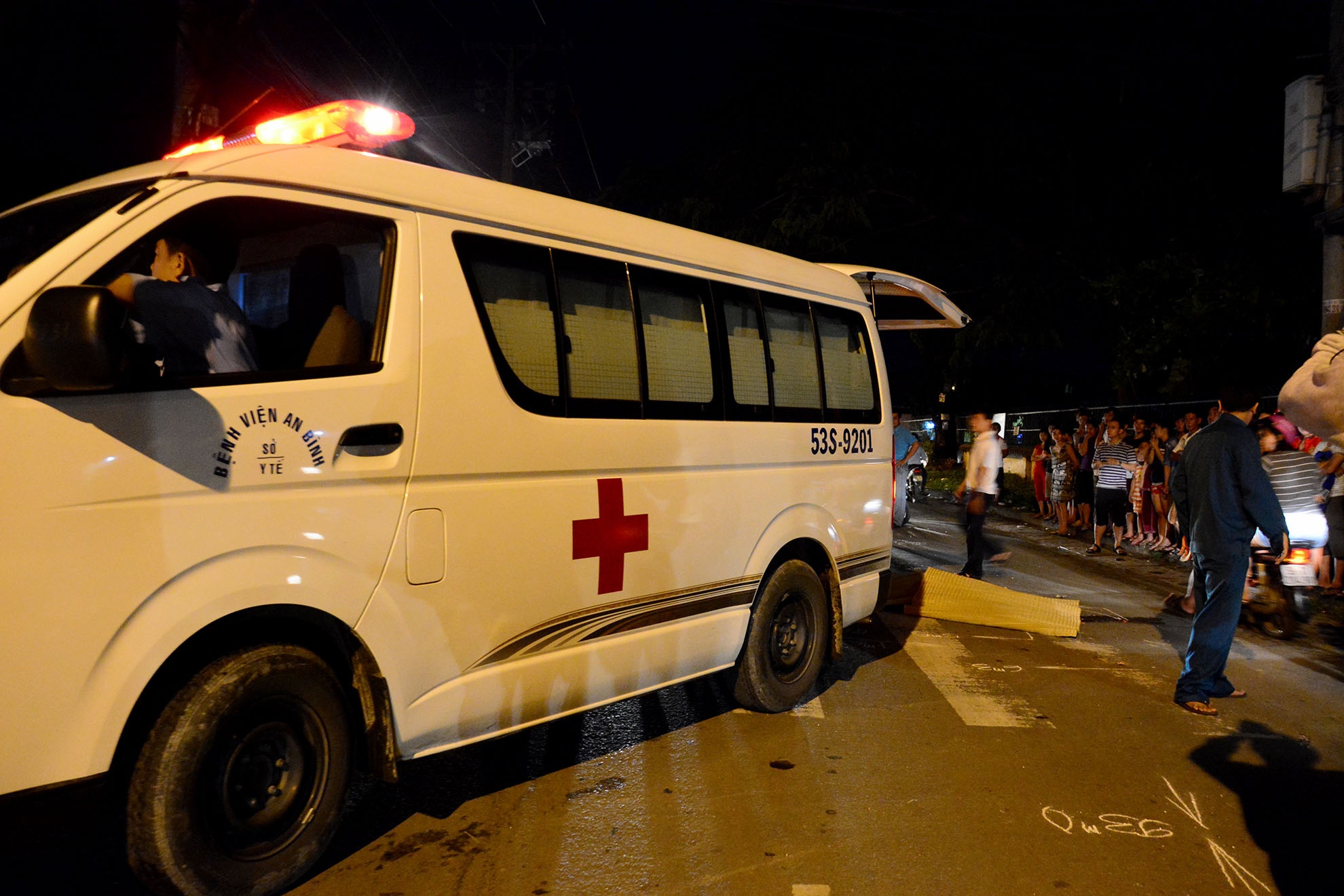 Tại hiện trường, xe máy và thi thể nạn nhân nằm giữa đường, xe buýt chạy tiếp một đoạn thì dừng lại sát lề.