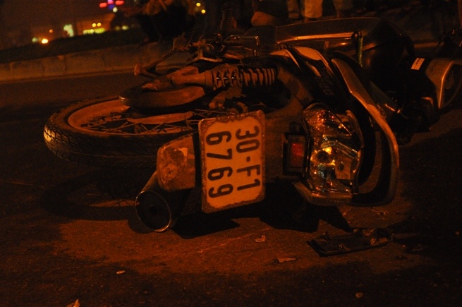 | Chiếc xe máy của nạn nhân nằm dưới đường. |
