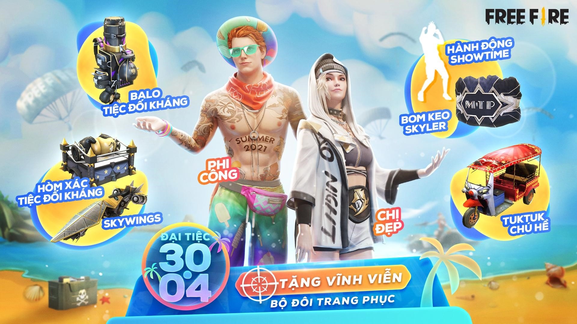 Dịp nghỉ lễ 30/4 - 1/5 sắp tới, game thủ Free Fire sẽ có cơ hội nhận được các món quà hấp dẫn từ tựa game sinh tồn nổi tiếng này, gồm nhiều vật phẩm đáng giá: Balo tiệc đối kháng, hòm xác tiệc đối kháng, skywings, hành động showtime, bom keo skyler, tuktuk chú hề và đặc biệt nhất là bộ đôi trang phục vĩnh viễn "Chị Đẹp" và "Phi Công". Trong đó, bộ trang phục "Chị Đẹp" sẽ mang dấu ấn đậm nét của nữ ca sĩ Hòa Minzy.
