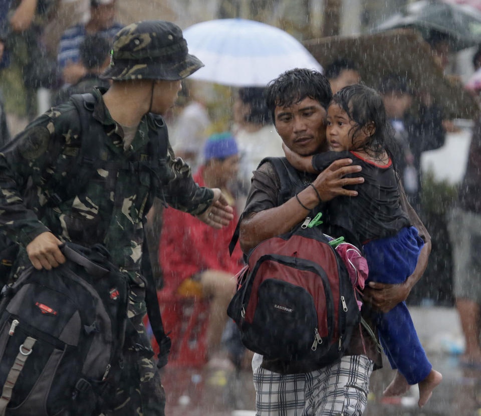 Với người cha này, những giọt mưa đã không còn là vấn đề lớn, bởi một binh sĩ đang dẫn anh và con lên máy bay. Ảnh: AP.