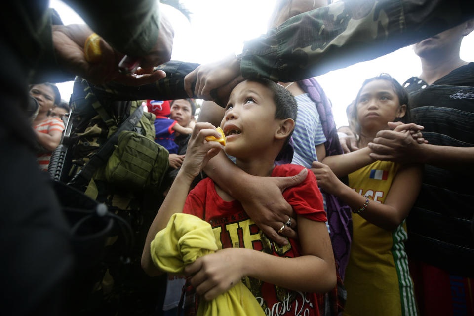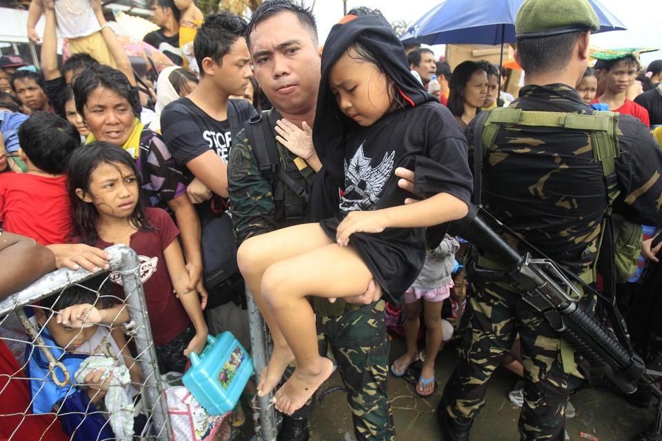 Trong khi binh sĩ bế một bé gái lên máy bay, một bé khác mếu máo vì chưa đến lượt. Nhiều người tuyệt vọng ở lại Tacloban. Cụ Aristone Balute, một cụ già 81 tuổi phải ở lại, vừa khóc vừa nói: “Chúng tôi không ăn, uống từ chiều hôm qua”. Bộ quần áo của cụ ướt sũng. Những giọt nước mắt lăn dài trên gò má nhăn nheo. Ảnh: AP.
