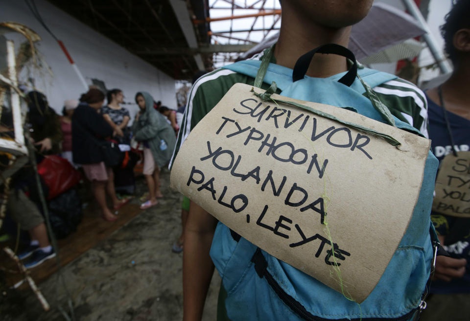 Một cậu bé đeo tấm biển với nội dung "Nạn nhân bão Yolanda, thị trấn Palo, tỉnh Leyte". Người dân địa phương gọi siêu bão Haiyan là Yolanda. Ảnh: AP.