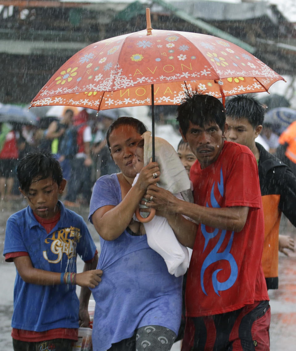 Một gia đình nhanh bước tới sân bay cùng trẻ nhỏ khi trời mưa tầm tã. Ảnh: AP.