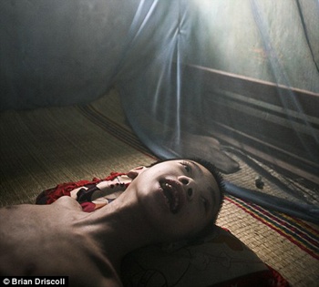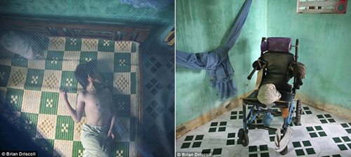 Tại nước láng giềng Campuchia, Phirum Ung, 5 tuổi, chỉ có thể nằm võng như trẻ sơ sinh. |