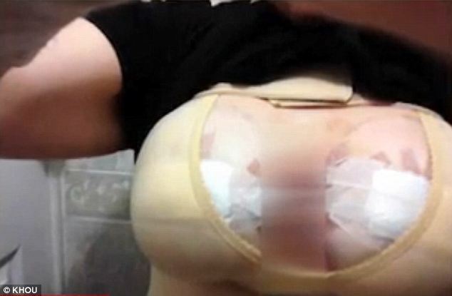 | Ngực bà Mimi Valdez biến dạng sau khi bác sĩ thẩm mỹ tại Mexico cắt da thừa. Ảnh: KHOU. |