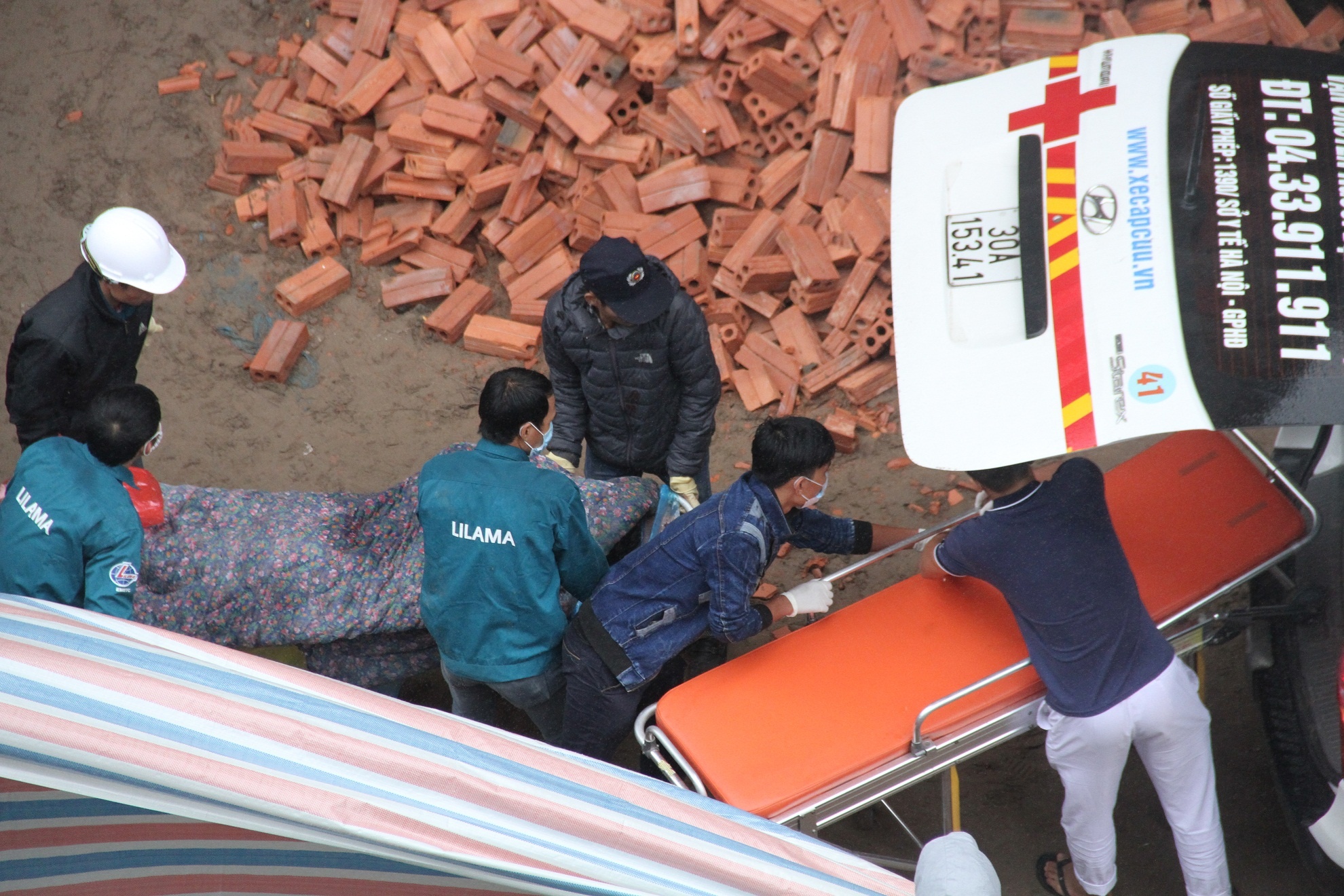Hai công nhân bị vùi lấp trong đống đổ nát, người còn lại văng cách vài mét. Nhiều công nhân chứng kiến la hét, tìm cách giải cứu.